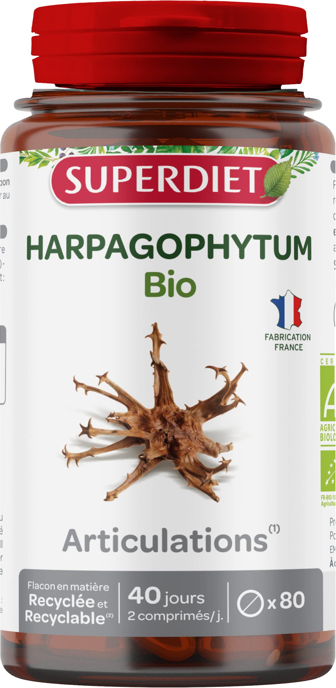 SUPERDIET - ORGANIC HARPAGOPHYTUM - Joints and mobility - French manufacturing - 80 tablets ? Maintain the flexibility and suppleness of your joints thanks to Superdiet Organic Harpagophytum! Harpagophytum is also known as "Devil's Claw": it allows you to maintain good mobility because it contributes to the proper functioning of your joints. Respecting the soil, our Harpagophytum is cultivated according to organic farming standards. ?Organic Harpagophytum (root) (powder (anti-caking agent: magnesium carbonate) and extract) - Bulking agent: ORGANIC acacia gum - Anti-caking agent: Talc - ORGANIC rice starch. ? For 1 tablet, Harpagophytum (Harpagophytum procumbens (Bruch.) DC and or Harpagophytum zeyheriDecne) 400 mg (equivalent in dry plants). ? Take 2 tablets per day, preferably in the morning during meals with a large glass of water. Intended for adults and adolescents over 12 years old. ? Not recommended for pregnant or breastfeeding women, as well as children under 12 years old. Not recommended in cases of gastric or duodenal ulcers or gallstones. It is recommended to respect the recommended doses, to ensure that you have a varied and balanced diet and a healthy lifestyle. Keep out of reach of young children. .FR ECOLABELS ASSOCIATED WITH THIS PRODUCT Organic farming (AB) Our guide to ecolabels Our eco-responsible store INGREDIENTS ORGANIC Harpagophytum (root) (powder (anti-caking agent: magnesium carbonate) and extract) - Bulking agent: ORGANIC acacia gum - Anti-caking agent: Talc - ORGANIC rice starch. ? For 1 tablet, Harpagophytum (Harpagophytum procumbens (Bruch.) DC and or Harpagophytum zeyheriDecne) 400 mg (equivalent in dry plants). DIRECTIONS FOR USE Take 2 tablets per day, preferably in the morning during meals with a large glass of water. Intended for adults and adolescents over 12 years old. SAFETY WARNING Not recommended for pregnant or breastfeeding women, as well as children under 12 years old. Not recommended in cases of gastric or duodenal ulcers or gallstones. It is recommended to respect the recommended doses, to ensure that you have a varied and balanced diet and a healthy lifestyle. Keep out of reach of young children. OUR VALUES ? Founded in 1961 by Mr. René Haussin, a renowned naturopath, SUPERDIET is a French brand based in Hauts-de-France. Pioneers of organic and committed, we manufacture food supplements that respect health and people. DIRECTIONS FOR USE ? Take 2 tablets per day, preferably in the morning during a meal with a large glass of water. Intended for adults and adolescents over 12 years old (refer to the precautions for use). OPTIMAL QUALITY ? SUPERDIET has selected for you a harpagophytum, certified ORGANIC and VEGAN, 100 natural, formulated and manufactured in France in our workshops in Hauts-de-France. KEY INGREDIENTS ? Harpagophytum is also known as "Devil's Claw": it allows you to maintain good mobility because it contributes to the proper functioning of your joints. JOINT COMFORT AND MOBILITY ? Contribute to the proper functioning of your joints with Superdiet Organic Harpagophytum. Harpagophytum contributes to the proper functioning of your joints and helps maintain good joint mobility. SUPERDIET - HARPAGOPHYTUM BIO - Articulations et mobilité - Fabrication française - 80 comprimés ? Maintenez la flexibilité et la souplesse de vos articulations grâce à l'Harpagophytum Bio Superdiet ! L'Harpagophytum est aussi connu sous le nom de "Griffe du diable" : il vous permet de maintenir une bonne mobilité car il participe au bon fonctionnement de vos articulations. Dans le respect des sols, notre Harpagophytum est cultivé selon les normes de l'agriculture biologique. ?Harpagophytum BIO (racine) (poudre (antiagglomérant : carbonate de magnésium) et extrait) - Agent de charge : Gomme d'acacia BIO - Anti-agglomérant : Talc - Amidon de riz BIO. ? Pour 1 comprimé, Harpagophytum (Harpagophytum procumbens (Bruch.) DC et ou Harpagophytum zeyheriDecne) 400 mg (équivalent en plantes sèches). ? Prendre 2 comprimés par jour, de préférence le matin pendant le repas avec un grand verre d'eau. Destiné aux adultes et aux adolescents de plus de 12 ans. ? Déconseillé aux femmes enceintes ou allaitantes, ainsi qu'aux enfants de moins de 12 ans. Déconseillé en cas d'ulcères gastrique ou duodénal ou de calculs biliaires. Il est recommandé de respecter les doses onseillées, de veiller à avoir une alimentation variée et équilibrée et un mode de vie sain. Tenir hors de la portée des jeunes enfants. .FR ÉCOLABELS ASSOCIÉS À CE PRODUIT Agriculture biologique (AB) Notre guide des écolabels Notre boutique éco-responsable INGRÉDIENTS Harpagophytum BIO (racine) (poudre (antiagglomérant : carbonate de magnésium) et extrait) - Agent de charge : Gomme d'acacia BIO - Anti-agglomérant : Talc - Amidon de riz BIO. ? Pour 1 comprimé, Harpagophytum (Harpagophytum procumbens (Bruch.) DC et ou Harpagophytum zeyheriDecne) 400 mg (équivalent en plantes sèches). MODE D'EMPLOI Prendre 2 comprimés par jour, de préférence le matin pendant le repas avec un grand verre d'eau. Destiné aux adultes et aux adolescents de plus de 12 ans. AVERTISSEMENT DE SÛRETÉ Déconseillé aux femmes enceintes ou allaitantes, ainsi qu'aux enfants de moins de 12 ans. Déconseillé en cas d'ulcères gastrique ou duodénal ou de calculs biliaires. Il est recommandé de respecter les doses onseillées, de veiller à avoir une alimentation variée et équilibrée et un mode de vie sain. Tenir hors de la portée des jeunes enfants. NOS VALEURS ? Fondée en 1961 par M.René Haussin, naturopathe reconnu, SUPERDIET est une marque française basée dans les Hauts-de-France. Pionniers du Bio et engagés, nous fabriquons des compléments alimentaires respectueux de la Santé et de l'Homme. CONSEILS D'UTILISATION ? Prendre 2 comprimés par jour de préférence le matin pendant le repas avec un grand verre d'eau. Destiné aux adultes et adolescents de plus de 12 ans (se référer aux p