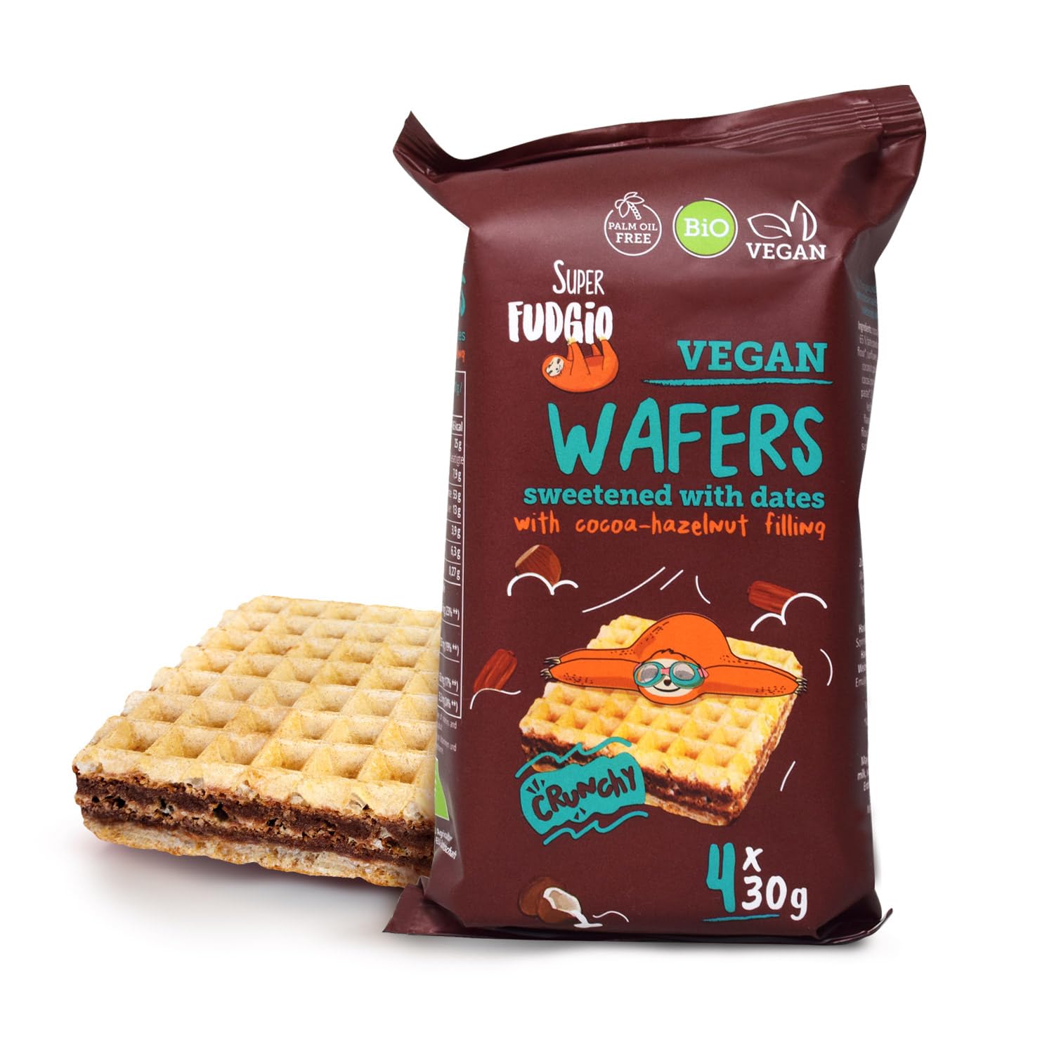 Organic cocoa cream waffles are a Clean-Label product and incredibly delicious. One pack is four times the pleasure – you can share this unique taste with others or enjoy it all by yourself. It's worth grabbing because: Cocoa and nuts provide energy and have a positive effect on mood. The powder is rich in potassium, magnesium, copper, and other vitamins and minerals. White flour is replaced with gluten-free, easily digestible rice flour. The hazelnut flavor is completely natural. All raw materials used to make the waffles come from certified organic farms. Clean Label: no palm oil, no glucose syrup, no fructose, no preservatives, and no flavor enhancers. Ingredients: Cocoa and nut cream 60 : peanut powder 29.8 , sunflower oil, rice flour, coconut powder, low-fat cocoa powder 5.8 , hazelnut paste 2 , emulsifier: sunflower lecithin, natural hazelnut flavoring. Waffle 40 : wheat flour (95 ), coconut oil , salt. From organic farming. Nutritional values per 100g: Energy: 1938 kJ 464 kcal Fat: 23g of which: saturates 4.2g Carbohydrate: 58g Sugar: 13g Fiber: 3.9g Protein: 7.9g Salt: 0.41g INGREDIENTS "Cocoa and nut cream 60 : date powder 29.8 , sunflower oil , rice flour , coconut powder , low-fat cocoa powder 5.8 , hazelnut paste 2 , emulsifier: sunflower lecithin , natural hazelnut flavoring. Waffle 40 : wheat flour (95 ), coconut fat , salt. From organic farming"SUPER FUDGiO Gaufres bio avec crème au cacao et aux noisettes Sucrées avec des dattes au lieu de sucre sans huile de palme Snack végétalien 4 x 30 g (120 g (1 paquet)DESCRIPTION DU PRODUIT DESCRIPTION DU PRODUIT Les gaufres bio à la crème de cacao cacao sont un produit Clean-Label, et un très délicieux. Un lot est une quatre fois plus de plaisir - Vous pouvez partager ce goût unique avec d'autres ou manger seul. Cela vaut la peine de l'attraper, car : Le cacao et les noix apportent de l'énergie et ont un effet positif sur l'humeur. La poudre est riche en potassium, magnésium, cuivre et autres vitamines et minéraux. La farine blanche est remplacée par de la farine de riz sans gluten et facile à digérer. L'arôme de noisettes est entièrement naturel. Toutes les matières premières utilisées pour la fabrication des gaufres proviennent de cultures certifiées. Clean Label : pas d'huile de palme, pas de sirop de glucose, de fructose, de conservateurs ou d'exhausteurs de goût. Ingrédients : Crème de cacao et de noix 60 : poudre de sillon x 29,8 , huile de tournesol, farine de riz, poudre de noix de coco, poudre de cacao faible en graisse, 5,8 , pâte de noisetier 2 , émulsifiant : lécithine de tournesol, arôme naturel de noisette. Gaufre 40 : farine de blé (95 ), graisse de coco , sel. Issu de l'agriculture biologique. Valeurs nutritionnelles pour 100 g. Valeur énergétique : 1938 kJ 464 kcal. Graisse : 23 g. dont : acides gras saturés 4,2 g. Glucides : 58 g. 13 g de sucre. Fibre 3,9 g. Protéines : 7,9 g. Sel : 0,41 g. INGRÉDIENTS "Crème de cacao et de noix 60 : poudre de datte 29,8 , huile de tournesol , farine de riz , poudre de noix de coco , poudre de cacao faible en gras 5,8 , pâte de noisette 2 , émulsifiant : lécithine de tournesol , arôme naturel de noisette. Gaufre 40 : farine de blé (95 ), graisse de coco , sel. Issu de l'agriculture biologique