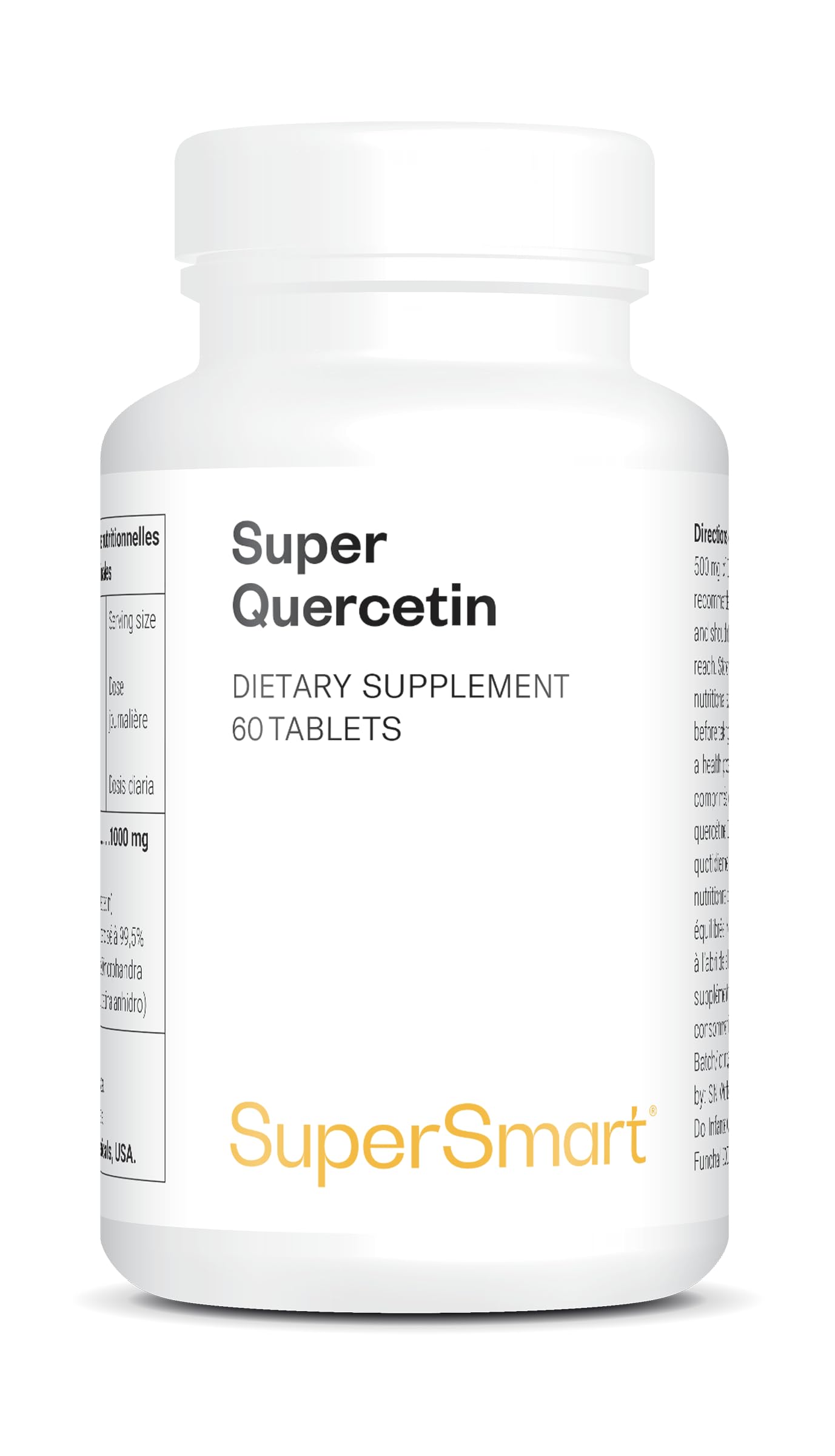 DIRECTIONS FOR USE: Take 1 to 2 tablets daily or as directed by your healthcare professional. This product is a nutritional supplement and should not be used as a substitute for a balanced and varied diet or a healthy lifestyle. Keep out of reach of children, away from light, heat, and moisture. DIRECTIONS FOR USE: Take 1 to 2 tablets daily or as directed by your healthcare professional. This product is a nutritional supplement and should not be used as a substitute for a balanced and varied diet or a healthy lifestyle. Keep out of reach of children, away from light, heat, and moisture. NATURAL INGREDIENTS: Quercetin is naturally extracted from the Dimorphandra mollis tree using sustainable and responsible practices. Vegan and gluten-free! At Supersmart, we choose raw materials rich in active ingredients. We also prioritize eco-responsible practices and natural excipients. A NATURAL ANTIHISTAMINE: This is the most advanced patented anhydrous quercetin supplement on the market (scientifically proven by studies). It is 170 better absorbed than regular quercetin. Combined with vitamin C, bromelain, and rutin, it offers complete protection, particularly for reducing allergies. Protect yourself from viruses, stress, and seasonal ailments! ? SUPERSMART: With 31 years of expertise, we are one of the leading brands in Europe to market food supplements. Our formulas are developed by a Doctor of Microbiology and Immunology. With hundreds of thousands of satisfied customers, Supersmart is a key player in nutritional supplementation.CONSEIL D'UTILISATION : Prendre 1 à 2 comprimés par jour ou selon les conseils de votre thérapeute. Ce produit est un supplément nutritionnel et ne doit pas être utilisé en remplacement d'une alimentation équilibrée et variée, ni d'un mode de vie sain. Conservez hors de portée des enfants, à l'abri de la lumière, de la chaleur et de l'humidité. CONSEIL D'UTILISATION : Prendre 1 à 2 comprimés par jour ou selon les conseils de votre thérapeute. Ce produit est un supplément nutritionnel et ne doit pas être utilisé en remplacement d'une alimentation équilibrée et variée, ni d'un mode de vie sain. Conservez hors de portée des enfants, à l'abri de la lumière, de la chaleur et de l'humidité. DES INGRÉDIENTS NATURELS : La quercétine est extraite naturellement de l'arbre Dimorphandra mollis selon des pratiques durables et responsables. Vegan et sans gluten ! Chez Supersmart, nous choisissons des matières premières riches en ingrédients actifs. Nous privilégions aussi les démarches éco-responsables et les excipients naturels. UN ANTIHISTAMINIQUE NATUREL : C'est le supplément de quercétine anhydre breveté le plus avancé du marché (scientifiquement prouvé par des études). Il est 170 mieux absorbé que la quercétine classique. Combiné à de la vitamine C, de la bromélaïne et de la rutine, il offre une défense complète et notamment pour diminuer les allergies. Protégez-vous des virus, du stress et des maux saisonniers !. ? SUPERSMART : 31 ans d'expertise, nous sommes l'une des premières marques en Europe à commercialiser des compléments alimentaires. Nos formules sont mises au point par un Docteur en microbiologie et en immunologie. Avec des centaines de milliers de clients satisfaits, Supersmart figure comme un acteur incontournable de la supplémentation nutritionnelle.Super Quercétine - Diminue les Allergies - Renforce l'Immunité - 70 Mieux Absorbé que la Quercétine Classique - 60 gélules vegan - Supersmart