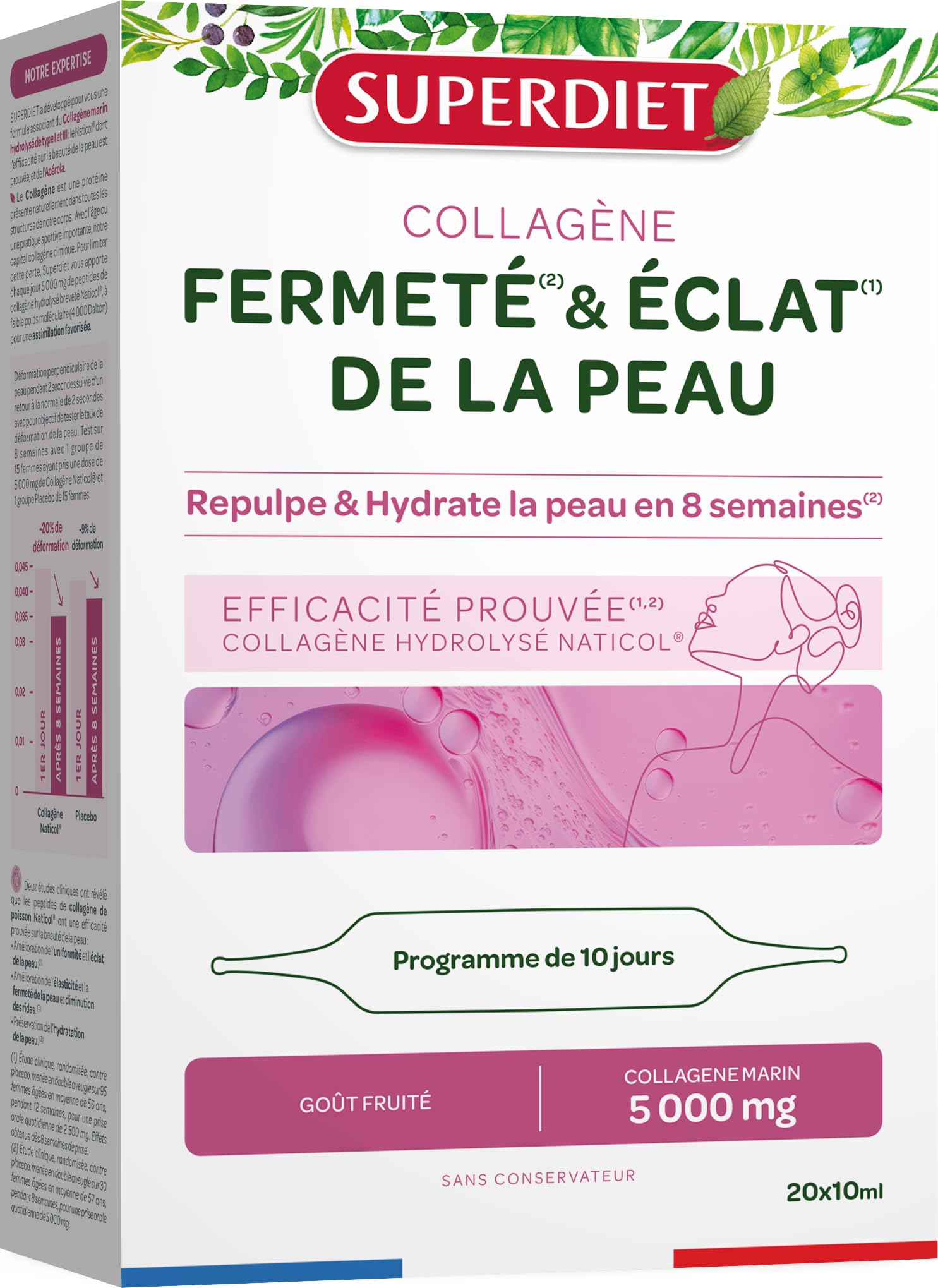 SUPERDIET - MARINE COLLAGEN - Skin Beauty - Radiance Firmness - Made in France - 20 x 10ml ampoules ? Collagen is an abundant fibrous protein found in the human body. It is an essential component of the structure and function of various tissues, including skin, bones, tendons, ligaments, and cartilage. There are several types of collagen, each with a specific function in the body: Type I Collagen is found in skin tissue. Type II Collagen is located in tendons and cartilage. Type III Collagen is found in connective tissues, particularly in the walls of blood vessels and in smooth muscles. Collagen is naturally produced by the body, but its production decreases with age or due to intense physical activity. Superdiet has developed an innovative formula for you combining proven-effective marine collagen types I and III with acerola. Naticol Collagen contains both types I and III. It improves skin firmness and elasticity, reduces the appearance of wrinkles, and gives the complexion a more even and radiant glow. Proven effectiveness: clinical study conducted on 60 women aged 46 to 69 for 8 weeks, with a daily intake of 5 grams of Naticol Collagen. Superdiet provides you with 5 grams of low molecular weight (4000 Daltons) Naticol hydrolyzed collagen peptides daily for enhanced absorption. ? Purified water - Hydrolyzed marine collagen (FISH) - Lemon and pomegranate juice concentrates - Dehydrated acerola juice concentrate (fruit) Per 2 x 10ml ampoules: 5g of hydrolyzed marine collagen, including 4.92g of protein, 300mg, equivalent to 3g of dehydrated acerola juice concentrate (Malpighia glabra L.) ? Take 2 ampoules daily, either straight or mixed with your favorite beverage, 15 minutes before breakfast. ? Adults and adolescents aged 12 and over (refer to the precautions for use). Do not exceed the recommended daily intake. Maintain a varied and balanced diet and a healthy lifestyle. Keep out of reach of young children. ?OUR VALUES ? By choosing SUPERDIET, you support a French manufacturing laboratory committed to your well-being. Since our creation in 1961, we have perpetuated the expertise of our founder, Mr. Haussin, naturopath and pioneer of organic products. Ingredients: Purified water - Hydrolyzed marine collagen (FISH) - Lemon and pomegranate juice concentrates - Dehydrated acerola juice concentrate (fruit) Per 2 x 10ml ampoules: 5g of hydrolyzed marine collagen, including 4.92g of protein, 300mg, equivalent to 3g of dehydrated acerola juice concentrate (Malpighia glabra L.) P.when('A').execute(function(A) { A.on('a:expander:toggle_description:toggle:collapse', function(data) { window.scroll(0, data.expander. expander[0].offsetTop-100) }) }) Directions for use: Take 2 ampoules per day, either neat or mixed with your preferred beverage, 15 minutes before breakfast. Adults and adolescents aged 12 and over (refer to precautions for use). Safety Warning: Do not exceed the recommended daily serving. Maintain a varied and balanced diet and a healthy lifestyle. Keep out of reach of young children. See moreOUR VALUES ? By choosing SUPERDIET, you support a French manufacturing laboratory committed to your well-being. Since our creation in 1961, we have perpetuated the expertise of our founder, Mr. Haussin, a naturopath and pioneer of organic products. DIRECTIONS FOR USE ? Take 2 ampoules per day, either neat or in the beverage of your choice, 15 minutes before breakfast. Adults and teenagers from 12 years of age (refer to the precautions for use). PROVEN EFFECTIVENESS ? The effectiveness of Naticol Collagen is proven by a study on 60 women aged 46 to 69, taking 5 g per day for 8 weeks. The results show firmer and more elastic skin, with optimized absorption thanks to a molecular weight of 4000 Daltons. FIRMNESS RADIANCE ? Naticol Collagen improves skin firmness and elasticity, reduces wrinkles, and evens skin tone thanks to its low molecular weight hydrolyzed peptides for better absorption. Skin is plumped and hydrated in 8 weeks. MARINE COLLAGEN ? Collagen, an essential fibrous protein, supports skin, bones, tendons, ligaments, and cartilage. Its production decreases with age or intense physical activity, hence the importance of supplements to maintain tissue health.Description du produit SUPERDIET - COLLAGÈNE MARIN - Beauté de la peau - Éclat Fermeté - Fabrication française - 20 ampoules de 10 ml ? Le Collagène est une protéine fibreuse abondante présente dans le corps humain. Il constitue une partie essentielle de la structure et de la fonction de divers tissus, notamment la peau, les os, les tendons, les ligaments et les cartilages.Il existe plusieurs types de collagène, chacun ayant une fonction spécifique dans le corps : le Collagène de type I est présent dans les tissus de la peau. le Collagène de type II est localisé dans les tendons et cartilage. le Collagène de type III est présent dans les tissus conjonctifs, notamment dans les parois des vaisseaux sanguins et dans les muscles lisses. Le Collagène est produit naturellement par le corps, mais sa production diminue avec l'âge ou du fait d'une pratique sportive importante. Superdiet a développé pour vous une formule innovante associant du Collagène marin de type I et III à l'efficacité prouvée et de l'Acérola.Le Collagène Naticol contient du type I et III. Il améliore la fermeté et l'élasticité de la peau, réduit l'apparence des rides et rend le teint plus homogène et éclatant. Efficacité prouvée : étude clinique réalisée sur 60 femmes âgées de 46 à 69 ans pendant 8 semaines à raison d'une prise de 5 grammes de Collagène Naticol par jour. Superdiet vous apporte chaque jour 5 grammes de peptides de Collagène hydrolysé Naticol à faible poids moléculaire (4000 Dalton) pour une assimilation favorisée.? Eau purifiée - Collagène marin hydrolysé (POISSON) - Jus concentrés de citron et grenade - Jus concentré déshydraté d'acérola (fruit) Pour 2 ampoule de 10ml : 5 g de Collagène marin hydroly