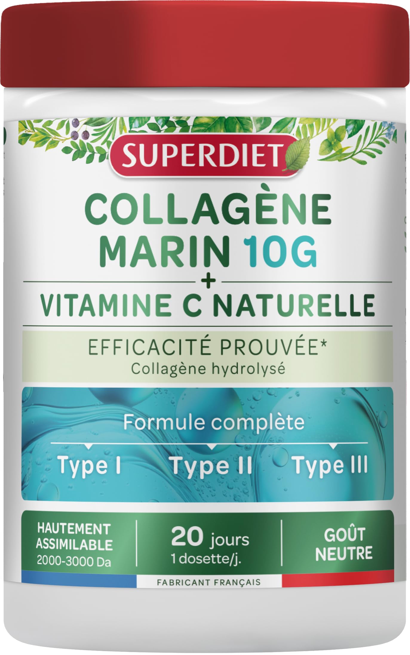 SUPERDIET - MARINE COLLAGEN NATURAL VITAMIN C - Unscented - Skin, Joints, Muscles - Made in France - 210g Powder ?Superdiet Marine Collagen: The effectively proven formula for radiant skin and healthy joints! ?Collagen is an abundant fibrous protein found in the human body. It is an essential part of the structure and function of various tissues, including skin, bones, tendons, ligaments, and cartilage. There are several types of collagen, each with a specific function in the body: Type I Collagen is found in skin tissue Type II Collagen is located in the tendons and cartilage of our joints Type III Collagen is found in connective tissues, particularly in the walls of blood vessels and in smooth muscles. Collagen is naturally produced by the body, but its production decreases with age or due to intense physical activity. Superdiet has developed a complete and innovative formula with PROVEN EFFECTIVENESS, combining TYPE I, II, and III marine collagen and natural vitamin C to meet all your needs. Naticol Collagen contains types I and III. It improves skin firmness and elasticity, reduces the appearance of wrinkles, and gives a more even and radiant complexion. Proven effectiveness: clinical study conducted on 60 women aged 46 to 69 for 8 weeks, with a daily intake of 5 grams of Naticol Collagen. Cartidyss Collagen contains type II. It is combined with natural vitamin C from acerola, which contributes to normal collagen formation for the normal function of bones and cartilage. Collagen is a protein that contributes to the growth and maintenance of muscle mass. 9.76 grams of protein per serving. Supediet provides you with 10 grams of low molecular weight (4000 Da) Naticol and Cartidyss hydrolyzed collagen peptides every day for enhanced absorption. Discover our marine collagen in an ultra-convenient powder format: 1 scoop per day to dissolve in the beverage of your choice. ?WHO? Adults and teenagers from 12 years old (refer to the precautions for use). HOW? 1 scoop (10.5 g) to dissolve in a large glass of water or the beverage of your choice. Mix until smooth. Using a shaker facilitates the dissolution of the powder. ?Hydrolyzed marine collagen extracted from the skin (type I III collagen) and cartilage (type II collagen) of FISH Dehydrated concentrated Acerola juice standardized for vitamin C (fruit) ? 1 scoop (10.5 g) to be dissolved in a large glass of water or the beverage of your choice. ? Mix until smooth. Using a shaker makes dissolving the powder easier. If you are pregnant or breastfeeding, consult your doctor. Do not exceed the recommended daily intake. Ensure you have a varied and balanced diet and a healthy lifestyle. Keep out of reach of young children. ? OUR VALUES ? By choosing SUPERDIET, you support a French manufacturing laboratory committed to your well-being. Since our creation in 1961, we have perpetuated the expertise of our founder, Mr. Haussin, naturopath and pioneer of organic products. Ingredients: Hydrolyzed marine collagen extracted from fish skin (type I III collagen) and cartilage (type II collagen) Dehydrated Acerola Juice Concentrate Standardized for Vitamin C (fruit) P.when('A').execute(function(A) { A.on('a:expander:toggle_description:toggle:collapse', function(data) { window.scroll(0, data.expander. expander[0].offsetTop-100) }) }) Instructions for Use: Take 1 scoop (10.5 g) and dissolve it in a large glass of water or your preferred beverage. Mix until smooth. Using a shaker will help dissolve the powder. For Adults Only (refer to precautions for use). Store in a dry place away from heat and light. Safety Warning: If you are pregnant or breastfeeding, consult your doctor. It is recommended to adhere to the recommended dosage, maintain a varied and balanced diet, and lead a healthy lifestyle. Keep out of reach of young children. Store in a dry place away from heat and light. See moreOUR VALUES ? By choosing SUPERDIET, you support a French manufacturing laboratory committed to your well-being. Since our creation in 1961, we have perpetuated the expertise of our founder, Mr. Haussin, a naturopath and pioneer of organic products. DIRECTIONS FOR USE ? Dissolve 1 scoop (10.5g) in a large glass of water or the beverage of your choice. Mix until smooth. Using a shaker makes dissolving the powder easier. Intended for adults and teenagers from 12 years of age (refer to the precautions for use). 100 NATURAL PROMISE ? SUPERDIET has developed a unique formula for you, a synergistic action combining 100 marine, hydrolyzed collagen and natural vitamin C, formulated and manufactured in France in our workshops in the Hauts-de-France region. 100 HYDROLIZED MARINE COLLAGEN ? Combination of TYPE I, TYPE II, TYPE III NATURAL VIT C: a complete and innovative formula providing you with 10G of low molecular weight collagen peptides (4000 Da) for enhanced absorption. SKIN FIRMNESS AND BONE CARTILAGE PROTECTION ? PROVEN EFFECTIVENESS! Following a clinical study, Naticol Collagen TYPE I and III will care for your skin. Cartidyss Collagen type II will care for your bones and cartilage.Description du produit SUPERDIET - COLLAGÈNE MARIN VITAMINE C NATURELLE - Sans arôme - Peau, articulations, muscles - Fabrication française - Poudre 210g?Superdiet Collagène Marin : La formule efficacement prouvée pour une peau radieuse et des articulations en pleine forme ! ?Le Collagène est une protéine fibreuse abondante présente dans le corps humain. Il constitue une partie essentielle de la structure et de la fonction de divers tissus, notamment la peau, les os, les tendons, les ligaments et les cartilages.Il existe plusieurs types de collagène, chacun ayant une fonction spécifique dans le corps : le Collagène de type I est présent dans les tissus de la peau. le Collagène de type II est localisé dans les tendons et cartilage de nos articulations.le Collagène de type III est présent dans les tissus conjonctifs, notamment dans les parois des vaisseaux sanguins et dans les muscles lisse