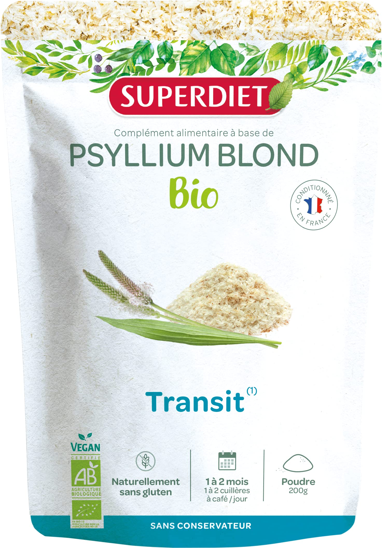 SUPERDIET - ORGANIC BLOND PSYLLIUM - Natural transit, Digestive well-being - Made in France - Resealable paper bag - Integuments 200 g ?Try our Organic Psyllium powder for intestinal well-being, proper functioning of the intestines and to facilitate transit! Psyllium was consumed 10 years BC by the Egyptians for its intestinal benefits. Also originating from India, its Indian name "ISPAGHUL" means "horse's ear", in reference to the shape of the seed. Our Organic Psyllium husks are obtained from seeds grown outdoors, harvested, sorted, and shelled, to recover the husks, which are then cleaned. Find our Organic Psyllium Blond in its powder format, to mix in the drink or food of your choice such as yogurt. ?100 ORGANIC blond psyllium (seed coat). May contain traces of MUSTARD and SESAME SEED. Psyllium husk (Plantago ovata Forssk) For 1 teaspoon: (from 7 to 12 years) 2.9 g, For 2 teaspoons ( 12 years - in 2 doses) 5.8g.?Shake the sachet well before taking. 1 to 2 teaspoons per day (i.e. approximately 2.9 to 5.8g day) in two doses, preferably in the morning. Per dose: dilute 1 teaspoon (approximately 2.9 g) in a large glass of water, mix well and consume the mixture immediately. To finalize the absorption of the product, rinse the glass well with water and drink this second glass of water. It is important to drink plenty of water while taking the product. Close the bag tightly after opening. Store in a cool, dry place away from light. Not recommended for children under 6 years old and do not exceed 1 dose per day for children aged 7 to 12 years. Not recommended in cases of esophageal obstructions and gastrointestinal disease. Not recommended in case of swallowing problems, in case of bed rest or in the absence of an adequate quantity of liquid when ingesting this product because of the risk of suffocation. Not recommended if taking concomitant medications. If you are pregnant or breastfeeding, seek the advice of your doctor. Consult a doctor in case of diabetes and before use. It is recommended to respect the recommended doses, to ensure that you have a varied and balanced diet and a healthy lifestyle. Keep out of reach of young children. ?OUR VALUES ? By choosing SUPERDIET, you support a French manufacturing laboratory, committed to your well-being. Since our creation in 1961, we have perpetuated the know-how of our founder Mr. Haussin, naturopath and organic pioneer. INGREDIENTS Blonde psyllium (seed coat) DIRECTIONS FOR USE Shake the sachet well before taking. 1 to 2 teaspoons per day (i.e. approximately 2.9 to 5.8g day) in two doses, preferably in the morning. Per dose: dilute 1 teaspoon (approximately 2.9 g) in a large glass of water, mix well and consume the mixture immediately. To finalize the absorption of the product, rinse the glass well with water and drink this second glass of water. It is important to drink plenty of water while taking the product. Close the bag tightly after opening. Store in a cool, dry place away from light. SAFETY WARNING Not recommended for children under 6 years old and do not exceed 1 dose per day for children aged 7 to 12 years old. Not recommended in cases of esophageal obstructions and gastrointestinal disease. Not recommended in case of swallowing problems, in case of bed rest or in the absence of an adequate quantity of liquid when ingesting this product because of the risk of suffocation. Not recommended if taking concomitant medications. If you are pregnant or breastfeeding, seek the advice of your doctor. Consult a doctor in case of diabetes and before use. It is recommended to respect the recommended doses, to ensure that you have a varied and balanced diet and a healthy lifestyle. Keep out of reach of young children. OUR VALUES ? By choosing SUPERDIET, you are supporting a French manufacturing laboratory, committed to your well-being. Since our creation in 1961, we have perpetuated the know-how of our founder Mr. Haussin, naturopath and organic pioneer. DIRECTIONS FOR USE ?Depending on your age, take 1 to 2 teaspoons per day in two doses, preferably in the morning. It is important to drink plenty of water while taking the product. RESPONSIBLE PRODUCT ? Our product is packaged in France, certified organic and vegan, preservative-free and naturally gluten-free. Our eco-designed packaging is made up of a recyclable paper bag and a zip for easy closing. OPTIMAL QUALITY ?To guarantee high nutritional quality, our organic psyllium husks are obtained from seeds grown outdoors, harvested, sorted and hulled to recover the husks, which are then cleaned. NATURAL TRANSIT ? Organic Blond Psyllium has been used since ancient times for its intestinal benefits. Psyllium husks contribute to the proper functioning of the intestines and facilitate transit by means of a bulking effect. SUPERDIET - PSYLLIUM BLOND BIO - Transit naturel, Bien-être digestif- Fabriqué en France- Sachet papier refermable - Téguments 200 g ?Essayez notre poudre de Psyllium Bio pour le bien-être intestinal, le bon fonctionnement des intestins et pour faciliter le transit ! Le Psyllium était consommé 10 ans avant J-C par les Egyptiens pour son bienfait intestinal. Originaire également d'Inde, son nom indien "ISPAGHUL" signifie "oreille de cheval", en référence à la forme de la graine. Nos téguments de Psyllium Bio sont obtenus à partir des graines cultivées en plein air, récoltées, triées, et décortiquées, pour récupérer les téguments, qui sont ensuite nettoyés. Retrouvez notre Psyllium Blond Bio dans son format poudre, à mélanger dans la boisson ou l'aliment de votre choix type yaourt. ?100 Psyllium blond BIO (tégument de la graine).Peut contenir des traces de MOUTARDE et GRAINE DE SÉSAME. Tégument de psyllium (Plantago ovata Forssk) Pour 1 cuillère à café : ( de 7 à 12 ans) 2,9 g, Pour 2 cuillères à café ( 12 ans - en 2 prises) 5,8g.?Bien agiter le sachet avant la prise. 1 à 2 cuillères à café par jour (soit environ 2,9 à 5,8g jour) en deux prises, de