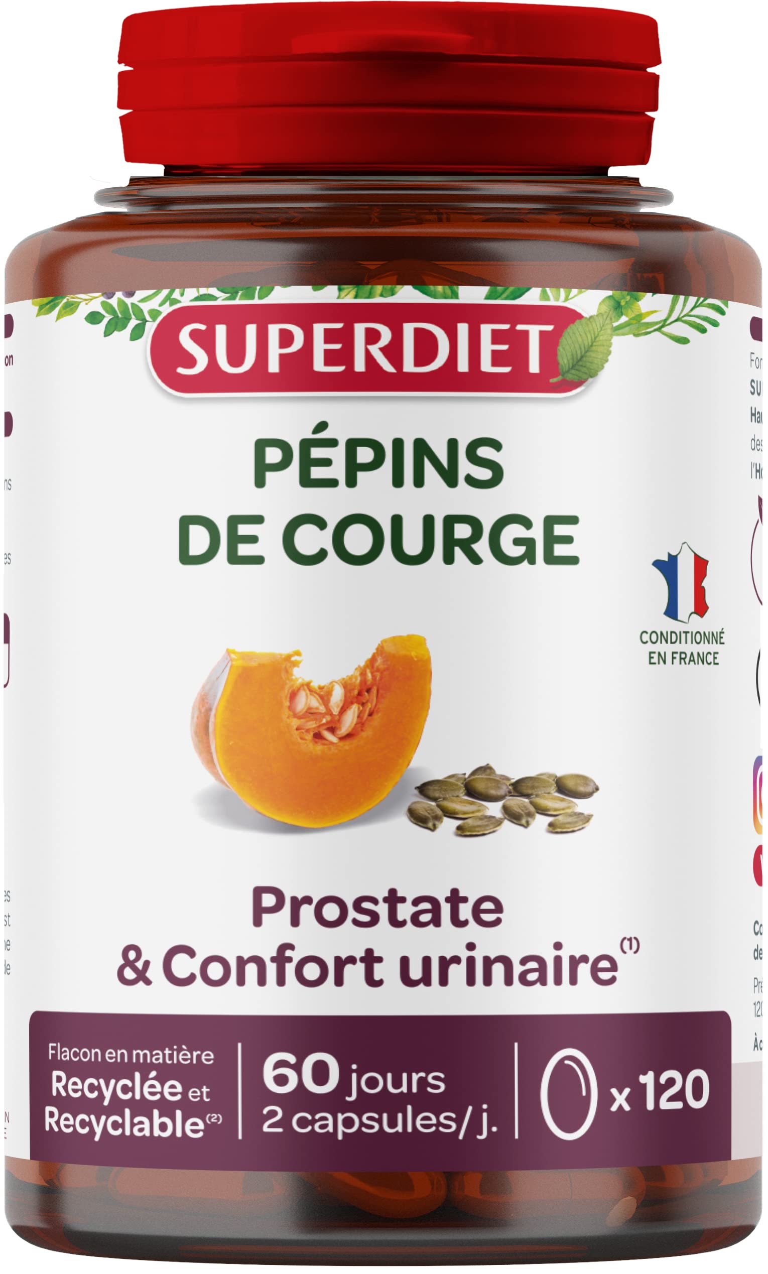 SUPERDIET – SQUASH SEEDS – Prostate Urinary Comfort – Phytotherapy – French Manufacturing – 120 capsules ? Due to the natural aging process or various health problems, the reproductive and urinary capacities of men may be affected. Conditions such as disorders of the genital system or prostate can occur. To maintain these essential functions, we offer plant-based solutions. The urinary system serves two crucial roles: it stores urine and facilitates its elimination, helping to rid the body of toxins. It is therefore essential to ensure that the urinary tract functions properly. At Superdiet, we have developed capsules based on pumpkin seed oil, which contribute to urinary comfort and support the proper functioning of the prostate. ? Take 2 capsules per day. During meals. Intended for Adults.? ORGANIC pumpkin seed oil, Capsule (FISH gelatin, humectant: ORGANIC glycerol) Average quantity for 2 capsules, Pumpkin seed oil (Cucurbita pepo L.) 1000 mg. ? Not recommended for pregnant and breastfeeding women as well as children and adolescents under 18 years of age. It is recommended to respect the recommended doses, to ensure that you have a varied and balanced diet and a healthy lifestyle. Keep out of reach of young children. INGREDIENTS ORGANIC pumpkin seed oil, Capsule (FISH gelatin, humectant: ORGANIC glycerol) Average quantity for 2 capsules, Pumpkin seed oil (Cucurbita pepo L.) 1000 mg. DIRECTIONS FOR USE Take 2 capsules per day. During meals. Intended for Adults (refer to precautions for use). SAFETY WARNING Not recommended for pregnant and breastfeeding women as well as children and adolescents under 18 years of age. It is recommended to respect the recommended doses, to ensure that you have a varied and balanced diet and a healthy lifestyle. Keep out of reach of young children. DISCLAIMER Non-contractual photography. The above indications are given for information purposes. They are not necessarily exhaustive and cannot replace the information appearing on the product packaging which alone is authentic, and to which you are invited to refer, particularly in the event of food intolerance. OUR VALUES ? Founded in 1961 by Mr. René Haussin, a renowned naturopath, SUPERDIET is a French brand based in Hauts-de-France. Pioneers of organic and committed, we manufacture food supplements that respect health and people. DIRECTIONS FOR USE ? Take 2 capsules per day, during meals. Intended for Adults. Not recommended for pregnant and breastfeeding women, as well as children and adolescents under 18. NATURAL SOLUTION ? At Superdiet, we have developed capsules based on Pumpkin Seed oil, packaged in our workshops in Hauts-De-France, which contribute to urinary comfort and support the proper functioning of the prostate. URINARY TRACT ? The urinary system fulfills two crucial roles: it stores urine and facilitates its elimination, thus helping to rid the body of toxins. It is therefore essential to ensure that the urinary tract functions properly. PROSTATE ? With age or health problems, male reproductive and urinary functions can decline. Our herbal solutions aim to maintain these crucial functions, particularly in cases of genital or prostate disorders. SUPERDIET – PÉPINS DE COURGE – Prostate Confort urinaire – Phytothérapie – Fabrication Française – 120 gélules ? En raison du processus naturel de vieillissement ou de divers problèmes de santé, les capacités reproductives et urinaires des hommes peuvent être affectées. Des affections telles que les troubles du système génital ou de la prostate peuvent se manifester. Pour maintenir ces fonctions essentielles, nous proposons des solutions à base de plantes. Le système urinaire remplit deux rôles cruciaux : il stocke l'urine et facilite son élimination, aidant ainsi à débarrasser le corps des toxines. Il est donc primordial de veiller à ce que les voies urinaires fonctionnent correctement. Chez Superdiet, nous avons développé des gélules à base d'huile de Pépins de Courge, qui contribuent au confort urinaire et soutiennent le bon fonctionnement de la prostate. ? Prendre 2 capsules par jour. Pendant les repas. Destiné aux Adultes.? Huile de pépins de courge BIO, Capsule (gélatine de POISSON, humectant : glycérol BIO) Quantité moyenne pour 2 capsules, Huile de pépins de courge (Cucurbita pepo L.) 1000 mg. ? Déconseillé aux femmes enceintes et allaitantes ainsi qu'aux enfants et aux adolescents de moins de 18 ans. Il est recommandé de respecter les doses conseillées, de veiller à avoir une alimentation variée et équilibrée et un mode de vie sain. Tenir hors de portée des jeunes enfants. INGRÉDIENTS Huile de pépins de courge BIO, Capsule (gélatine de POISSON, humectant : glycérol BIO) Quantité moyenne pour 2 capsules, Huile de pépins de courge (Cucurbita pepo L.) 1000 mg. MODE D'EMPLOI Prendre 2 capsules par jour. Pendant les repas. Destiné aux Adultes (se référer aux précautions d'emploi). AVERTISSEMENT DE SÛRETÉ Déconseillé aux femmes enceintes et allaitantes ainsi qu'aux enfants et aux adolescents de moins de 18 ans. Il est recommandé de respecter les doses conseillées, de veiller à avoir une alimentation variée et équilibrée et un mode de vie sain. Tenir hors de portée des jeunes enfants. CLAUSE DE NON-GARANTIE Photographie non contractuelle. Les indications ci-dessus sont données à titre d'information. Elles ne sont pas forcément exhaustives et ne sauraient se substituer aux informations figurant sur l'emballage du produit qui font seules foi, et auxquelles vous êtes invités à vous reporter, notamment en cas d'intolérance alimentaire. NOS VALEURS ? Fondée en 1961 par M.René Haussin, naturopathe reconnu, SUPERDIET est une marque française basée dans les Hauts-de-France. Pionniers du Bio et engagés, nous fabriquons des compléments alimentaires respectueux de la Santé et de l'Homme. CONSEILS D'UTILISATION ? Prendre 2 capsules par jour, pendant les repas. Destiné a