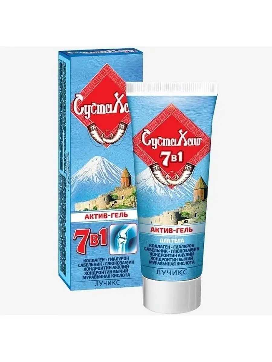 Гель-актив мазь СустаХаш с усиленной формулой - это лучшее средство от боли в суставах рук, ног, коленей: - хондроитин из костей крупнорогатого скота и хондроитин из акульих плавников, благодаря содержанию кальция, цинка, фосфора в высокой концентрации, стимулирует восстановление поврежденной костно-хрящевой ткани, предупреждает ее разрушение, ускоряет заживление костных переломов; - глюкозамин активизирует процесс регенерации костных тканей, придает прочность тканевым соединениям, нормализуют их работу; - коллаген и гиалуроновая кислота входят в состав синовиальной жидкости, способствуют улучшению межсуставного питания и смазки, сохраняют воду в хрящах в виде водных подушек, создают хорошую амортизацию, поглощая удары при движении;- сабельник тормозит воспалительные процессы в суставах и соединительной ткани; - муравьиная кислота и камфора улучшают микроциркуляцию крови, оказывают тонизирующее и обезболивающее действие, великолепно снимают напряжение и дискомфорт.