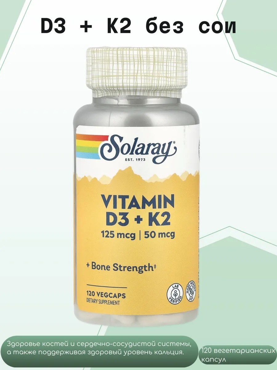 Эти витамины работают в комбинации для правильного усвоения кальция. Они являются мощными двигателям в поддержке здоровой сердечно-сосудистой системы, а также помогают создавать более крепкие кости. Улучшает состояние зубов. Эта формула сочетает в себе высокоэффективный природный источник D3 холекальциферола с клинически поддерживаемой порцией витамина K2 менахинона-7 (MK-7) из ферментированного нута. Поддерживает лучшее кровообращение и здоровье сердца. Улучшает состояние иммунной системы. Вегетарианская, без искусственных красителей и ароматизаторов. Применение: по 1 капсуле в день с едой.