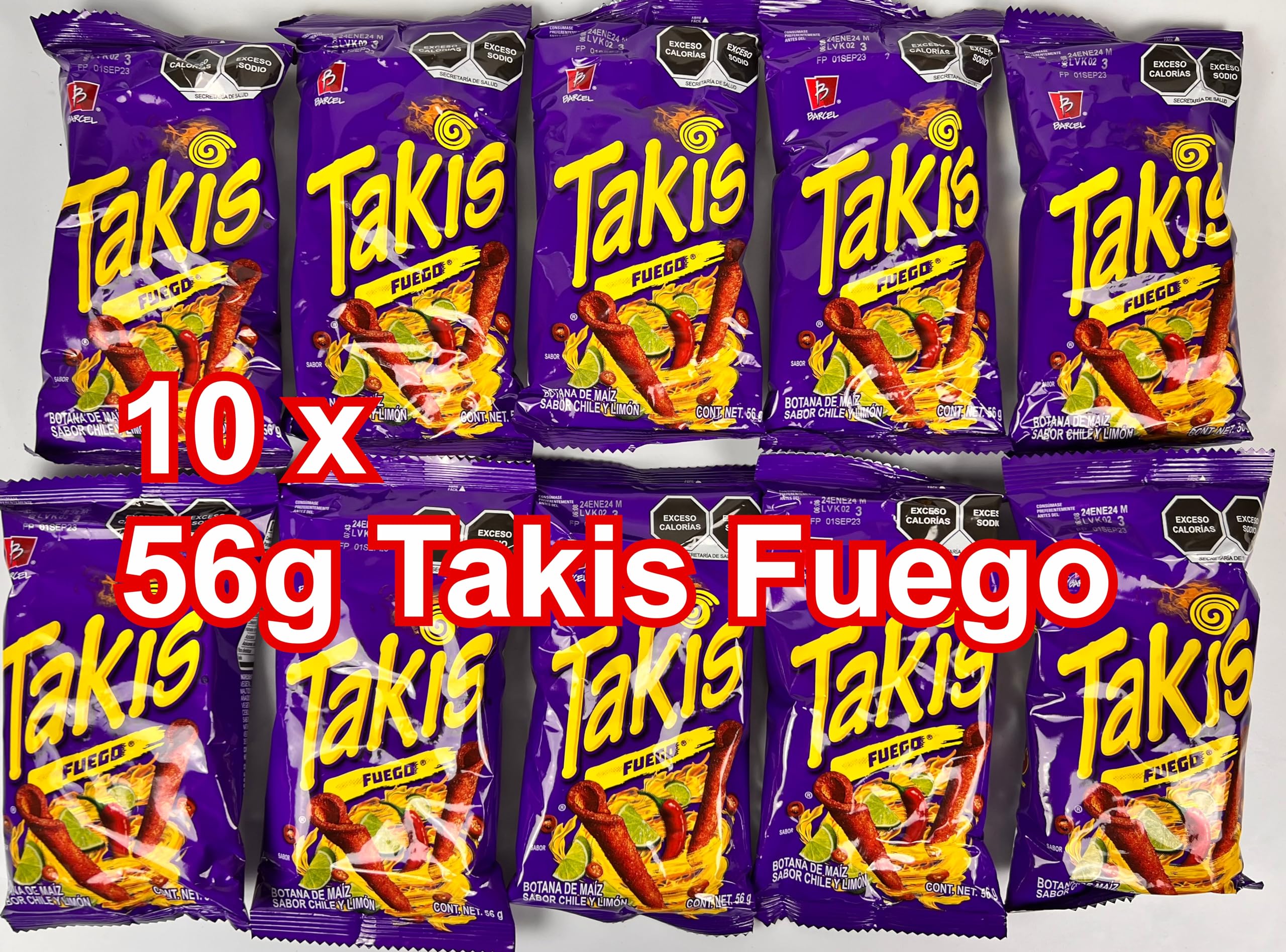 Ingredients: Corn flour (lime-treated), vegetable oil (palm and or soybean and or rapeseed oil), spices (salt, maltodextrin, citric acid, sugar, monosodium glutamate, hydrolyzed soy protein, onion powder, yeast extract, E129, E110, natural and artificial flavorings, sodium bicarbonate, soybean oil, chili pepper, disodium inosinate, disodium guanylate, E319 (preservative). Allergy information: Contains soy. Takis Fuego: Energy: 2092 kJ 500 kcal - Fat: 28.5 g, of which saturates: 7.14 g - Carbohydrate: 5.1 g, of which sugars: 3.6 g - Protein: 7.1 g - Salt: 1.5 g. INGREDIENTS Corn flour, vegetable oil (may contain palm, soybean, and or rapeseed oil), spices (including iodized salt, maltodextrin, citric acid, sugar, monosodium glutamate (MSG (E621))), vegetable protein (soy), artificial colors (Allura Red E129, Sunset Yellow FCF E110), onion, natural yeast extract, sodium bicarbonate, sodium carbonate (E500) INSTRUCTIONS Open the package and enjoy the chips. See moreTakis Fuego Lot de 10 paquets de 56 g de chips épicés au piment et citron vertDESCRIPTION DU PRODUIT DESCRIPTION DU PRODUIT Ingrédients : farine de maïs (traitée à la chaux), huile végétale (huile de palme et ou de soja et ou de colza), épices (sel, maltodextrine, acide citrique, sucre, glutamate monosodique, protéines de soja hydrolysées, oignon en poudre, extrait de levure, E129, E110, arômes naturels et artificiels, bicarbonate de sodium, huile de soja, piment, (chili), inosinate disodique, guanylate disodique, E319 (conservateur). Informations pour les personnes allergiques : contient du soja Takis Fuego : énergie : 2092 kJ 500 kcal - Graisse : 28,5 g, dont acides gras saturés : 7,14 g - Glucides : 5,1 g, dont sucres : 3,6 g. - Protéines : 7,1 g-7,14 g - Sel : 1,5 g. INGRÉDIENTS Farine de maïs Huile végétale (peut contenir de l'huile de palme, de soja et ou de colza) Épices (y compris sel iodé, maltodextrine, acide citrique, sucre, glutamate monosodique (E621)) Protéines végétales (soja) Colorants artificiels (Allura rouge E129, jaune coucher de soleil FCF E110) oignon Extrait de levure naturelle et naturelle Hydrosodium pour homme. carbonate de gène (E500) MODE D'EMPLOI Ouvrir le paquet et déguster les chips. Voir plus