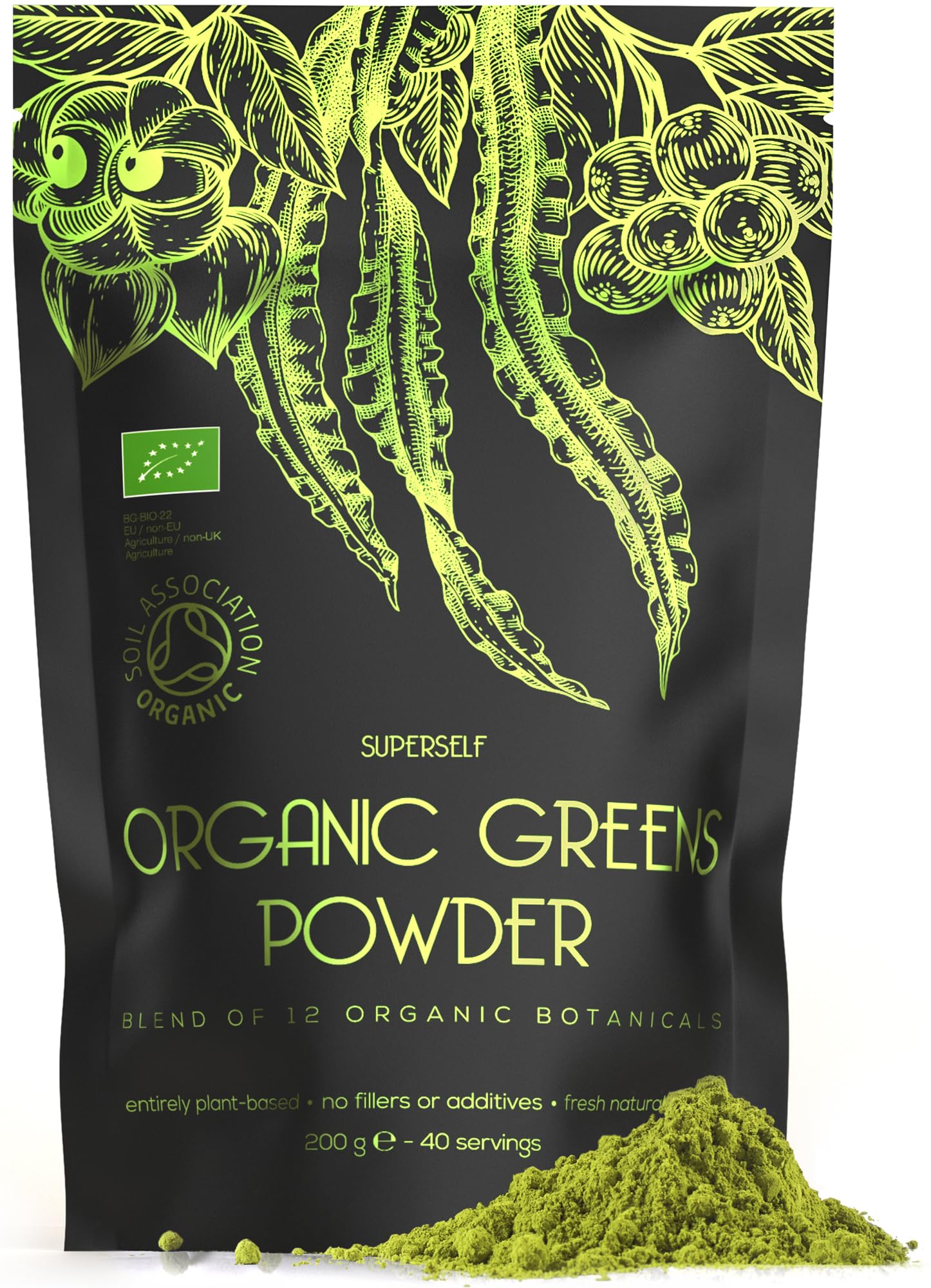 HALL OF FAME IN YOUR HAND - With a special focus on matcha and acai for their antioxidant properties, wheatgrass for cleansing, maca root for balancing and energizing, and spirulina and chlorella for their dense nutritional profiles, we offer a symphony of wellness in every serving. Suitable for vegans and vegetarians, each 200g pack provides 40 servings. CERTIFIED ORGANIC GREENS POWDER - Proudly certified by the UK Soil Association, this organic greens and superfood powder meets the highest standards of organic integrity and environmental sustainability. This certification ensures that every ingredient in our powder is grown and processed without the use of synthetic chemicals or GMOs, preserving the natural potency of our superfoods. QUICK, EASY AND PLEASANT - Make your health a priority by centring it in a simple daily ritual. Mix 1 teaspoon with a glass of water or fruit juice, and stir well - or add to your smoothie with all the ingredients in a blender. Thoughtfully designed to be supportive of gut health and energy levels, this green powder is suitable for daily use. EXCLUSIVE SUPERFOOD BLEND - Every organic ingredient in this powder has been carefully selected to work together in natural harmony; no fillers, colourings, or additives allowed. High in protein, fibre, vitamins and minerals - this super greens powder contains only wheatgrass, chlorella, spirulina, acai berry, matcha green tea, maca root, flaxseeds, baobab, barley grass, kale, kelp, and guarana. CURATED DAILY SUPERFOOD BOOST - This SuperSelf Organic Greens Powder combines 12 of the most-researched and best-loved superfoods into one convenient super greens blend. An ideal addition to your individual journey, this superfood powder supports wellness without compromising on taste, quality or convenience.