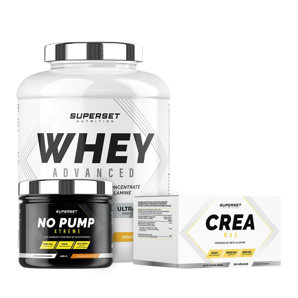 This detailed program has been developed by our teams of coaches and nutritionists. Combined with regular training and a healthy diet, your figure will be transformed. This program is intended for people who train to further develop volume and muscle mass. This allows you to increase your muscle growth and gain strength quickly. This program increases muscle volume, prevents fat mass, increases strength and intensity and provides more explosiveness for a stronger body in 5 weeks. The 100 Whey Protein Advance is an ultra-filtered protein, ideal for lean muscles. The No Pump Xtreme is the best pre-training booster to increase endurance. Crea Max makes it possible to maintain muscle volume. The confirmed program contains a glass of whey protein Advanced 2 kg Banana Split, a booster No Pump Xtreme with 420 g Long Island Icetea and a can of Crea Max with 252 capsules.Superset Nutrition - Bevestigd programma voor droge spiertoename - 100 Whey Proteine Advanced 2kg Banana Split - No Pump Xtreme - Créa MaxDit gedetailleerde programma is ontwikkeld door onze teams van coachs en voedingsdeskundigen. Gecombineerd met regelmatige training en een gezonde voeding wordt je figuur veranderd. Dit programma is bedoeld voor mensen die trainen om volume en spiermassa nog verder te ontwikkelen. Hiermee kun je je spiergroei verhogen en snel kracht krijgen. Dit programma verhoogt het spiervolume, voorkomt vetmassa, verhoogt kracht en intensiteit en zorgt voor meer explosiviteit voor een sterker lichaam in 5 weken. Het 100 Whey Protein Advance is een ultragefilterd eiwit, ideaal voor droge spieren. De No Pump Xtreme is de beste voortrainingsbooster ter verhoging van het uithoudingsvermogen. Crea Max maakt het mogelijk om spiervolume te behouden. Het bevestigde programma bevat een glas weiproteïne Advanced 2 kg Banana Split, een booster No Pump Xtreme met 420 g Long Island Icetea en een blikje Crea Max met 252 capsules.