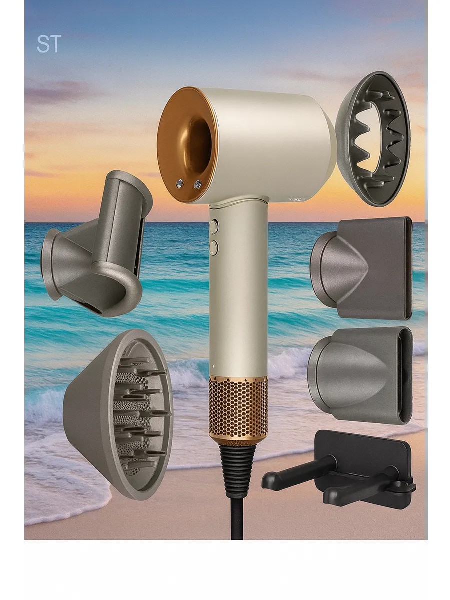 The powerful professional Supersonic Super Hair Dryer set with 5 magnetic attachments is an exact replica of the Dyson hair dryer and features similar technology for drying and styling hair. This styler model features special technology to protect hair from hot air, preventing damage to the hair and scalp. This hair dryer is perfect for daily use. Changing attachments is easy thanks to the magnetic bases, which do not heat up at all during operation. There are 4 temperature settings: for quick drying and styling; for standard drying; for drying at a lower temperature and separation; and for drying with cold air. It also features an ionization function, a curling diffuser, and a straightening attachment.