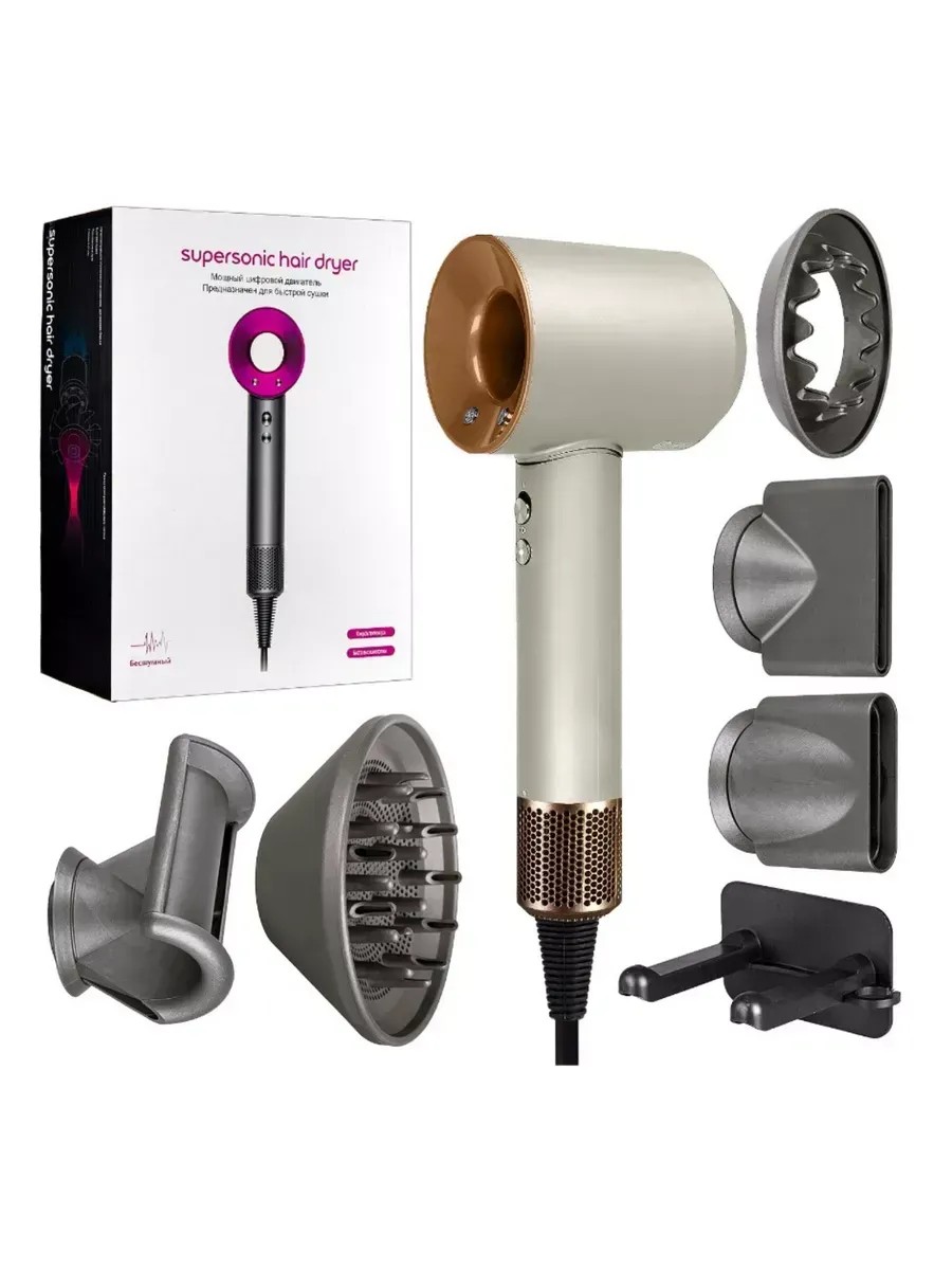 Мощный профессиональный набор Supersonic Super Hair Dryer и 5 магнитных насадок является абсолютной копией на фен Дайсон и имеет схожую технологию, предназначен для сушки и укладки волос. Данная модель стайлера имеет специальную технологию защиты волос от горячего воздуха, что позволит избежать повреждения волос и кожи головы. Фен для волос прекрасно подходит для ежедневного использования. Менять насадки очень просто благодаря магнитным основаниям, которые совершенно не нагреваются во время работы. Предусмотрено 4 температурных режима: для быстрого высушивания и укладки волос; для стандартного высушивания; для сушки при более низкой температуре и разделении; для высушивания холодным воздухом. Функция ионизации, диффузор для завивки и насадка выпрямления выпрямитель расческа.