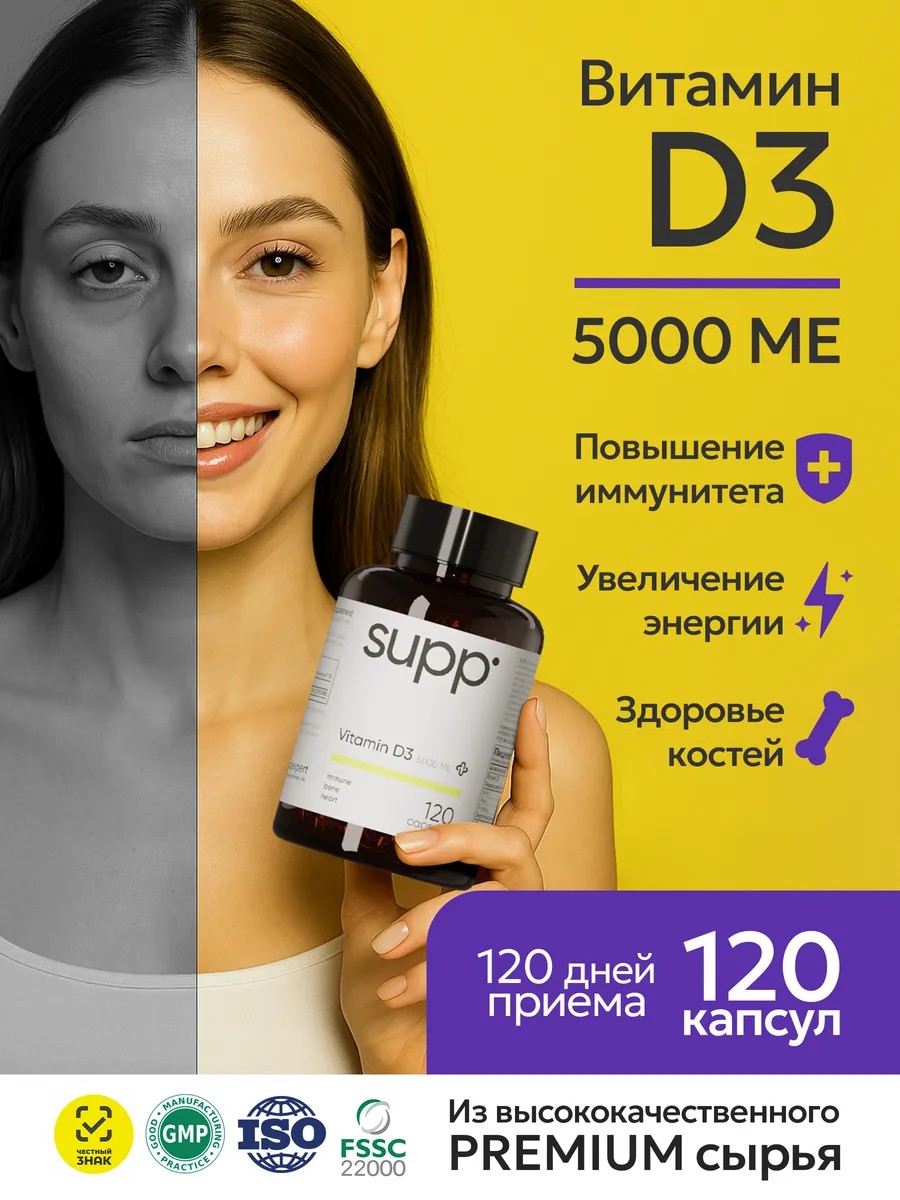 Витамин Д3 5000 МЕ — это эффективная пищевая добавка, созданная для укрепления иммунитета, костей, мышц и зубов. Каждая капсула содержит оптимальную дозировку холекальциферола в сочетании с натуральным подсолнечным маслом, что способствует лучшему усвоению витамина. Формула разработана для взрослых, включая мужчин и женщин, ведущих активный образ жизни или испытывающих дефицит из-за проживания в северных регионах. Удобная баночка с 120 капсулами рассчитана на 4 месяца приёма, делая добавку экономичным решением для долгосрочной поддержки здоровья.
