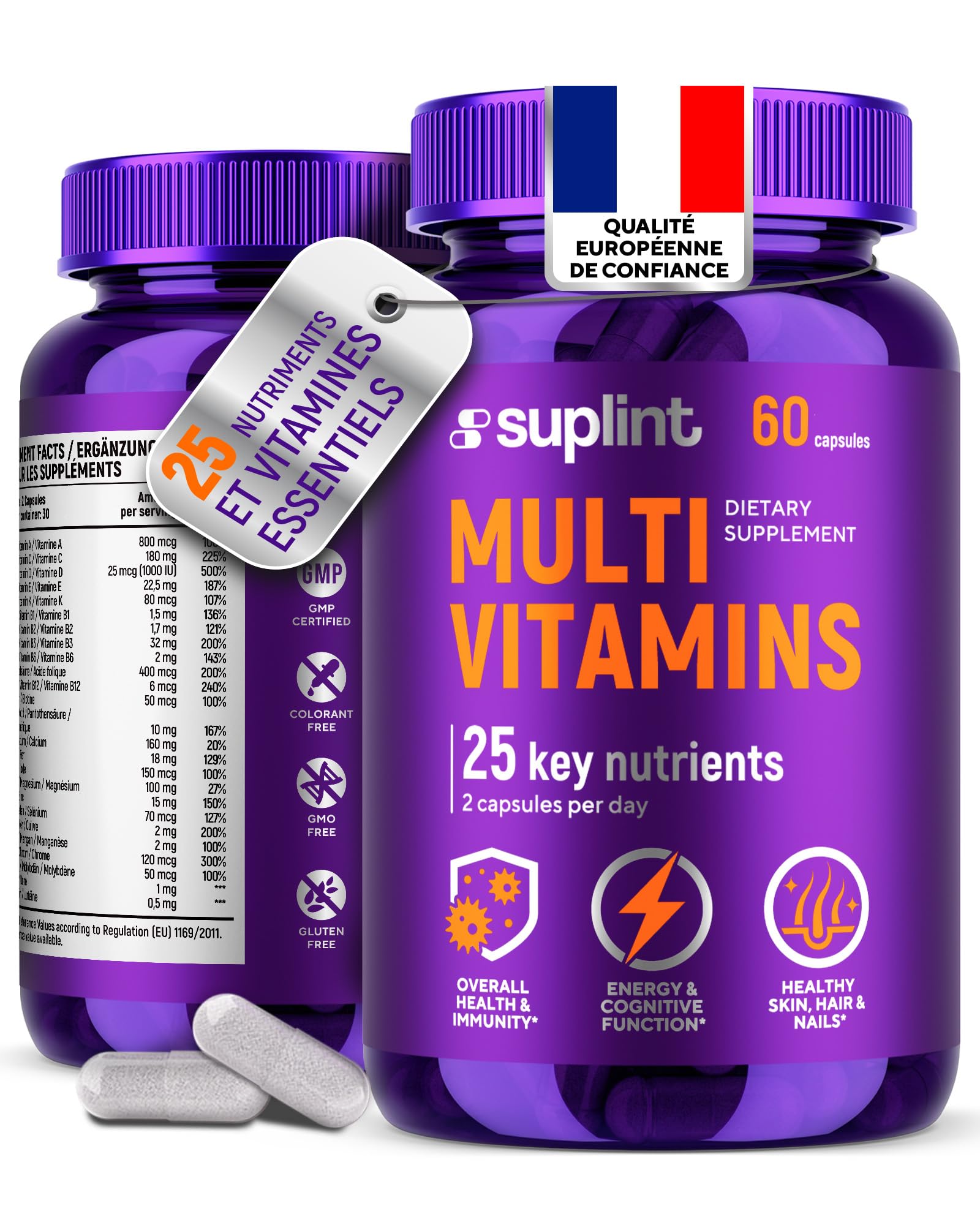 QUALITÉ EUROPÉENNE – Produit aux Pays-Bas selon les Bonnes Pratiques de Fabrication (GMP). Convient aux régimes végétaliens, sans gluten et sans OGM. FORMULATION AVEC LUTÉINE – Contient de la lutéine, de la vitamine A et du zinc, des ingrédients fréquemment inclus dans les formules multivitaminées pour une alimentation complète. VITAMINES POUR L'IMMUNITÉ – Contient des nutriments comme les vitamines A, C, D et le zinc, qui contribuent au fonctionnement normal du système immunitaire selon le Règlement (UE) 432 2012. ADAPTÉ AU QUOTIDIEN – Élaboré pour accompagner un mode de vie actif. Convient aux adultes recherchant un complément multivitaminé pratique dans une routine bien-être équilibrée. 25 INGRÉDIENTS ESSENTIELS DANS UNE FORMULE – Complexe multivitaminé conçu pour un apport quotidien, avec 25 vitamines et minéraux tels que les vitamines A, C, D, E, K1, B, zinc, chrome et sélénium.