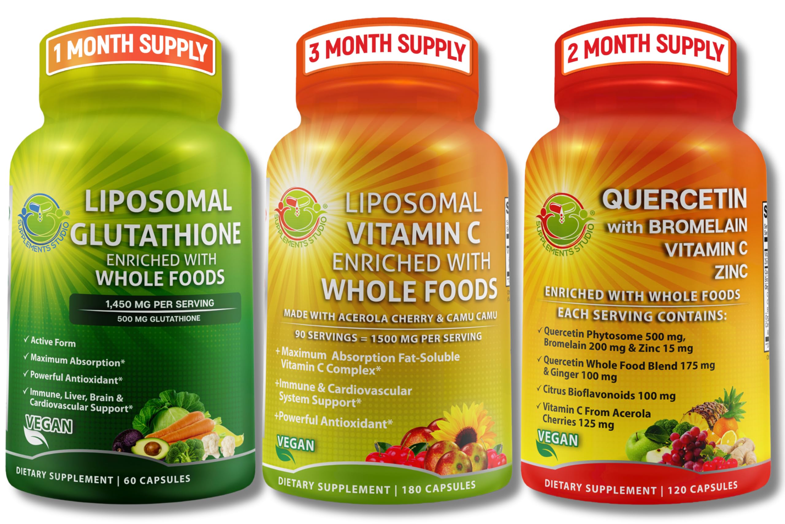 Support your immune system and overall vitality with this powerful antioxidant bundle combining Liposomal Vitamin C 1500mg, Liposomal Glutathione 500mg, and Quercetin with Bromelain, Zinc, and an organic whole food blend. Each formula is enhanced with organic ingredients like acerola cherry, camu camu, ginger, spinach, and broccoli for maximum absorption and effectiveness. This vegan, non-GMO trio promotes immune defense, cellular health, and respiratory function support—all without fillers or additives. Clean label, and made in a GMP-certified facility in the USA, it's your all-in-one solution for daily wellness support.Proudly Made in the U.S.: All our supplements are manufactured with rigorous quality control standards and strict adherence to current Good Manufacturing Practices (cGMP). Made with high quality natural and vegan non-GMO ingredients. Clean Non-GMO: Crafted with your health in mind, our products contain high-grade vitamins, minerals, and nutrients without the unwanted extras. Free from fillers like rice flour, magnesium stearate, and silicon dioxide, so you can trust what you're putting into your body. Formulated with integrity and transparency. Quercetin with Bromelain, Vitamin C Zinc (2-Month Supply): Each serving provides 500mg of Quercetin Phytosome, 200mg of Bromelain (from pineapple), 125mg of Vitamin C (from organic acerola cherry extract), 15mg of Zinc Picolinate, 175mg of Organic Quercetin Whole Food Blend (with apple, onion, red grapes broccoli), 100mg of Organic Ginger Root, and 100mg of Citrus Bioflavonoids (from organic lemon orange). Supports immune system and respiratory function. High-Absorption Liposomal Vitamin C (3-Month Supply): Delivers 1500mg of vitamin C per serving in a liposomal format for enhanced absorption and maximum effectiveness. Enriched with organic acerola cherries and organic camu camu, which are naturally rich in vitamin C, for an extra boost of nutrients. Liposomal Glutathione 500mg Enriched with Whole Foods (1-Month Supply): glutathione is a master antioxidant detoxifier. This formula features 500mg of the active form L-glutathione (Reduced), plus organic whole foods naturally rich in glutathione such as spinach, avocado, okra, broccoli, carrots more for plant-powered antioxidant and immune support.