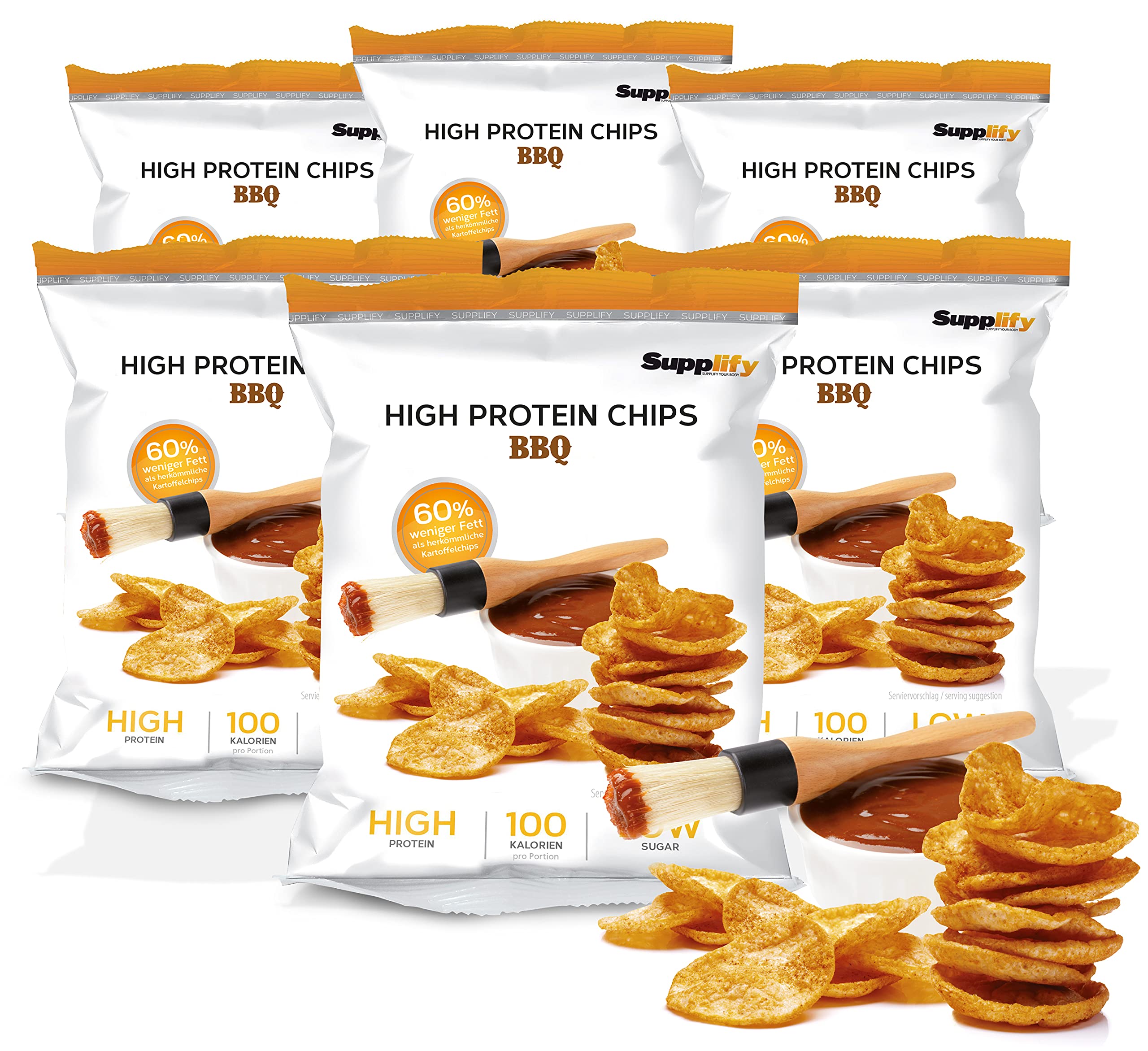 Supplify 24 x 50 g Chips Protéinées (Vegan, Saveur BBQ), Chips Protéinées Faibles en Glucides pour la Perte de Poids, Faibles en Calories, Snack Fitness Alternatif