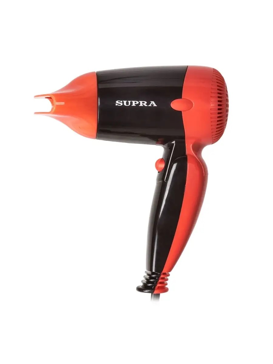 SUPRA PHS-1404S hair dryer in black and red. This compact travel hair dryer from SUPRA features a concentrator nozzle, two airflow speeds, and two temperature settings. It's perfect for styling your hair at home, at the cottage, on business trips, or on vacation.