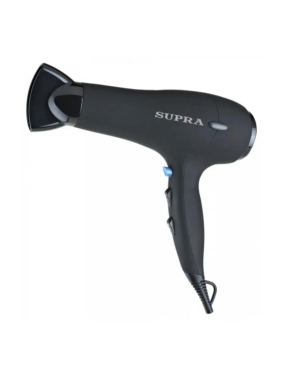 The stylish and functional SUPRA PHS-2204L hair dryer, featuring 2200W of power and a Soft Touch coating, 2 airflow speeds, 3 heat settings, and a concentrator, will help you style your hair whether you're at home, at the cottage, or on business trips or vacations. Straighten unruly strands, add volume at the roots, and set your style with the cool shot feature. Its Soft Touch housing makes it comfortable and pleasant to hold, while its all-black finish and blue cool shot button make it incredibly stylish and eye-catching. It's perfect for use not only at home but also in beauty salons or on-site events. The cool shot feature will prevent dryness and breakage. Concentrator nozzle - 8 x 5.2 cm. Nozzle diameter - 5 cm. Grid diameter - 4.7 cm. Cord length - 186 cm. Number of nozzles - 1. Number of speeds - 2. Number of temperature settings - 3.