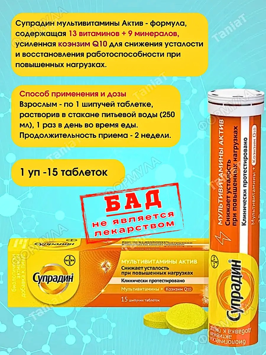| Полное наименование товара | Супрадин мультивитамины актив 15 шт. таблетки шипучие массой 4,9 г |