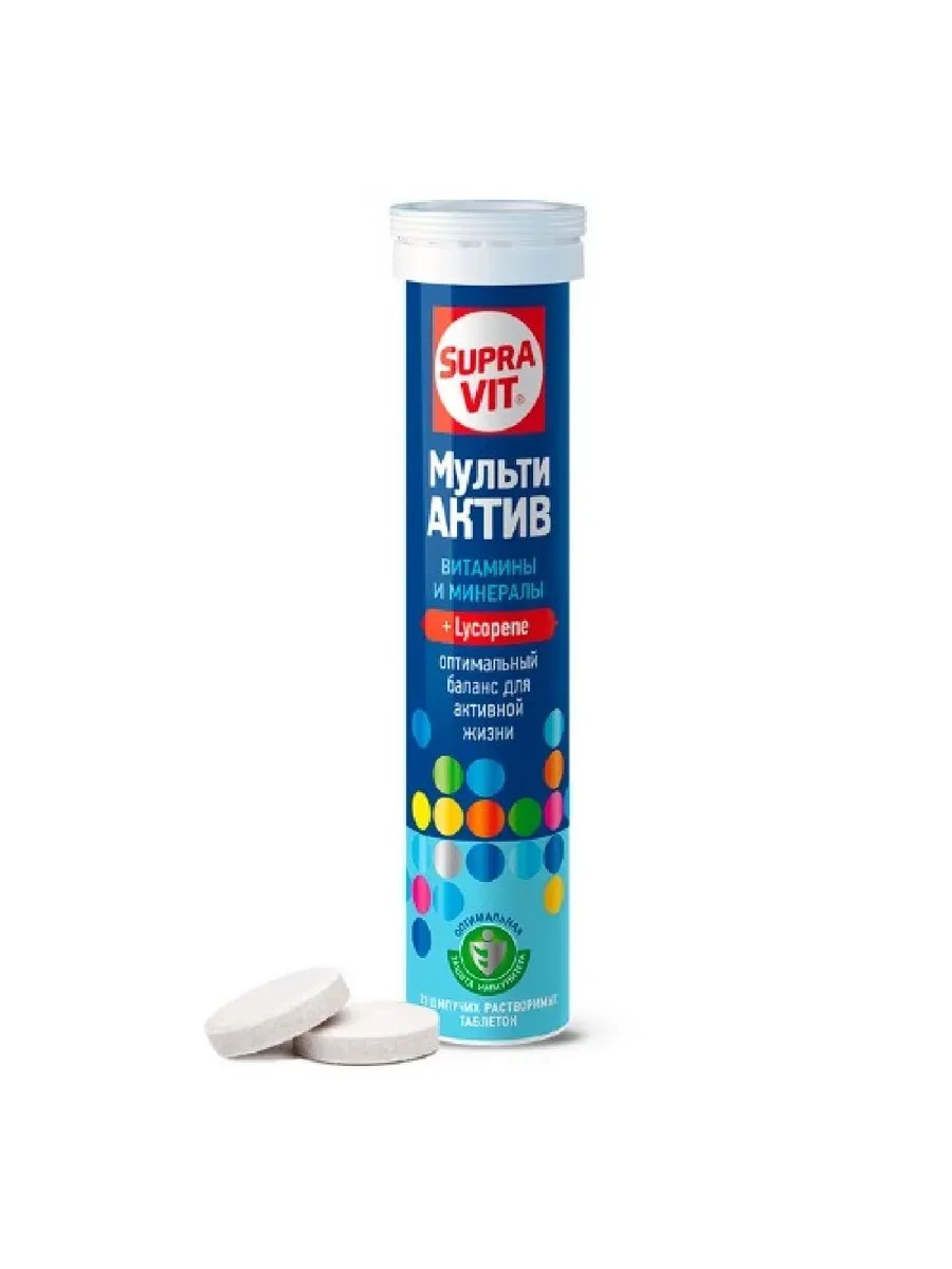 Биологически активная добавка Суправит Мульти Актив в форме шипучих таблеток содержит комплекс витаминов и минералов, дополненный ликопином.
