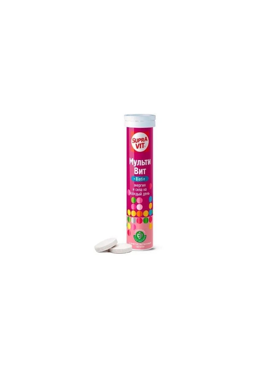 Supravit Multi-Vit N20 spike tablets, 4.0 g each. An additional source of vitamins. As a biologically active food supplement. Vitamin complex (vitamins C, retinol acetate, alpha-tocopherol acetate, thiamine mononitrate, riboflavin phosphate, pyridoxine g/chloride, cyanocobalamin, cholecalciferol, nicotinamide, folic acid, calcium pantothenate, beta-carotene, biotin, auxiliary: citric acid, sodium bicarbonate, dextrose, aspartame, orange flavoring. For sale to the population through the pharmacy network and specialized stores, departments of the retail network as a biologically active food supplement - an additional source of vitamins (hereinafter according to the appendix). Biologically active components, mg / tab.: vitamin A - 0.9, E - 10.0, B1 - 2.0, B2 - 2.0, B12 - 5 mcg, C - 75, D3 - 5 mcg, niacin - 20, folic acid - 200 mcg, pantothenic acid - 10, biotin - 50 mcg. -