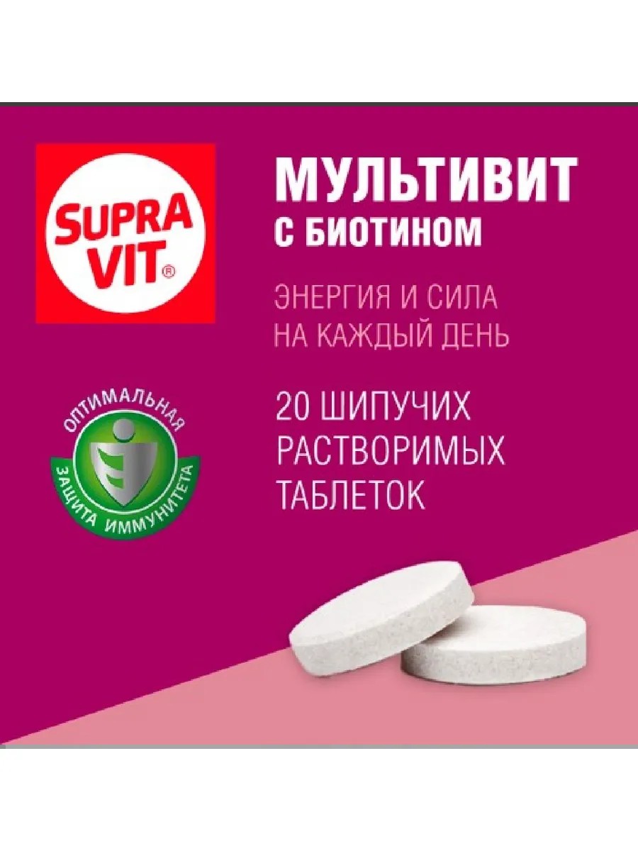Биологически активная добавка Суправит МультиВит в форме шипучих таблеток содержит комплекс витаминов и минералов, дополненный биотином.