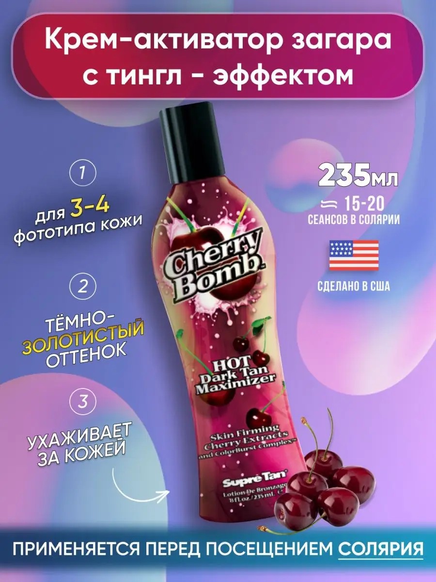 Активатор с лёгким тингл эффектом Cherry Bomb от американского бренда Supre Tan. Для загара крем подходит для 3 и 4 фототипа кожи. Усиливает и стимулирует загар, создает глубокий темный оттенок, закрепляет загар и ухаживает за кожей: укрепляет кожную ткань, защищает от преждевременного старения. Имеет тепловой эффект. Входящий в состав комплекс ингредиентов ColorBurst Complex усиливают естественную секрецию пигмента в клетках, что способствует ровности и стойкости загара.