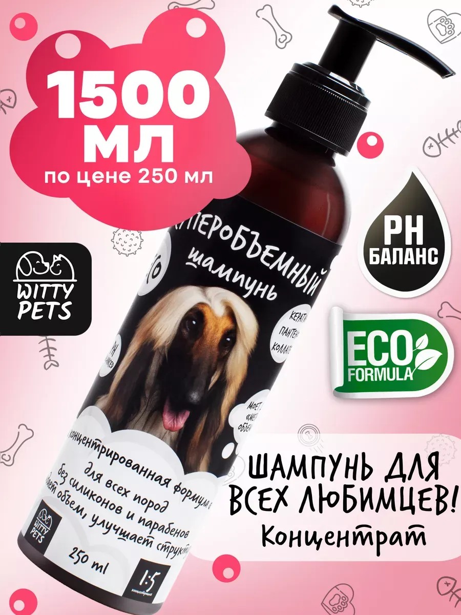 Witty Pets concentrated super-volume shampoo for all breeds (use diluted 1:5). Indispensable for caring for fine hair. Collagen and keratin integrate into the hair structure, leaving the coat thicker, healthier, silkier, and more fluffy. Thanks to its natural formula, it rinses off easily and thoroughly cleanses impurities. It doesn't dry out the skin, moisturizes well, adds shine to the coat, has an antistatic effect, and slows the formation of tangles. It lathers beautifully and rinses off easily, cleans impurities, adds shine to the coat, and prevents tangles. Suitable for long-haired and short-haired breeds, small, medium, and large animals, and for all breeds of dogs and cats. Use with Witty Pets conditioner.
