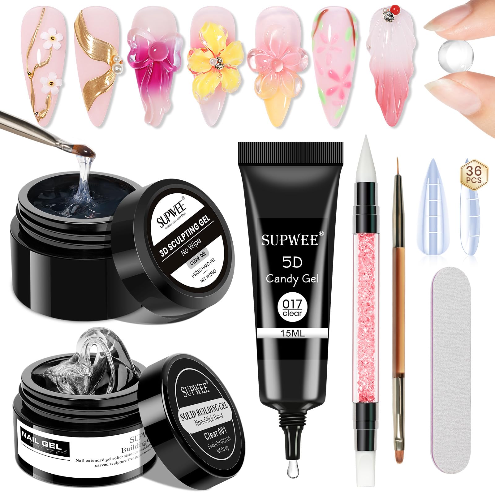 SAFETY WARNING noHelpful tips: Please use the 3D silicone molds if you find the designs difficult to create yourself. If the design is too thick, please allow it to cure longer. Ideal choice: These nail builder gels are perfect for nail art enthusiasts. They can be used to create many nail styles and are perfect as a surprise for Valentine's Day, birthdays, Halloween, or Christmas. Durable: All our gel nails are made from ingredients free of harmful substances, are low-odor, non-toxic, cruelty-free, and environmentally friendly. Sculpting gel: These nails are suitable for 3D shaping, modeling, and painting. To embellish with accessories, apply glue to the nail surface and place the accessories to cure. With this 3D gel kit, you can freely create different designs. 3D Gel Kit: You will receive 1 x 14g builder gel, 1 x 15g 3D sculpting gel, 1 x 15g Candy gel, 36 nail tips, 1 nail polish and 2 nail art pens with two tips for your DIY creations at home.SUPWEE Kit de nail art 3D, Solid Builder Gel semi-solide, semi-solide, pour ongles en gel, multifonction, sculpture 3D, pour sculpter des motifs, pour le design des ongles DIYDESCRIPTION DU PRODUIT AVERTISSEMENT DE SÉCURITÉ noConseils chaleureux : veuillez utiliser les moules en silicone 3D si vous sentez que les motifs sont difficiles à fabriquer vous-même. Veuillez laisser le motif durcir plus longtemps s'il est trop épais. Choix idéal : ces gels de construction pour ongles conviennent à un amateur d'ongles. Il peut être utilisé pour créer de nombreux styles d'ongles, parfait comme surprise pour la Saint-Valentin, les anniversaires, Halloween ou Noël. Durable : tous nos ongles en gel sont fabriqués à partir d'ingrédients sans substances nocives, à faible odeur, non toxique, sans expérimentation animale et respectueux de l'environnement. Gel de sculpture : ces ongles sont adaptés pour la mise en forme 3D, la modélisation et la peinture. Pour embellir avec des accessoires, appliquez la colle sur la surface de l'ongle et placez les accessoires pour durcir. Avec ce kit de gel 3D, vous pouvez créer librement différents designs. Kit de gel 3D : vous recevrez 1 gel de construction de 14 g, 1 gel de sculpture 3D de 15 g, 1 gel Candy de 15 g, 36 pointes d'ongles, 1 vernis à ongles et 2 stylos nail art avec deux têtes pour vos créations de bricolage à la maison.