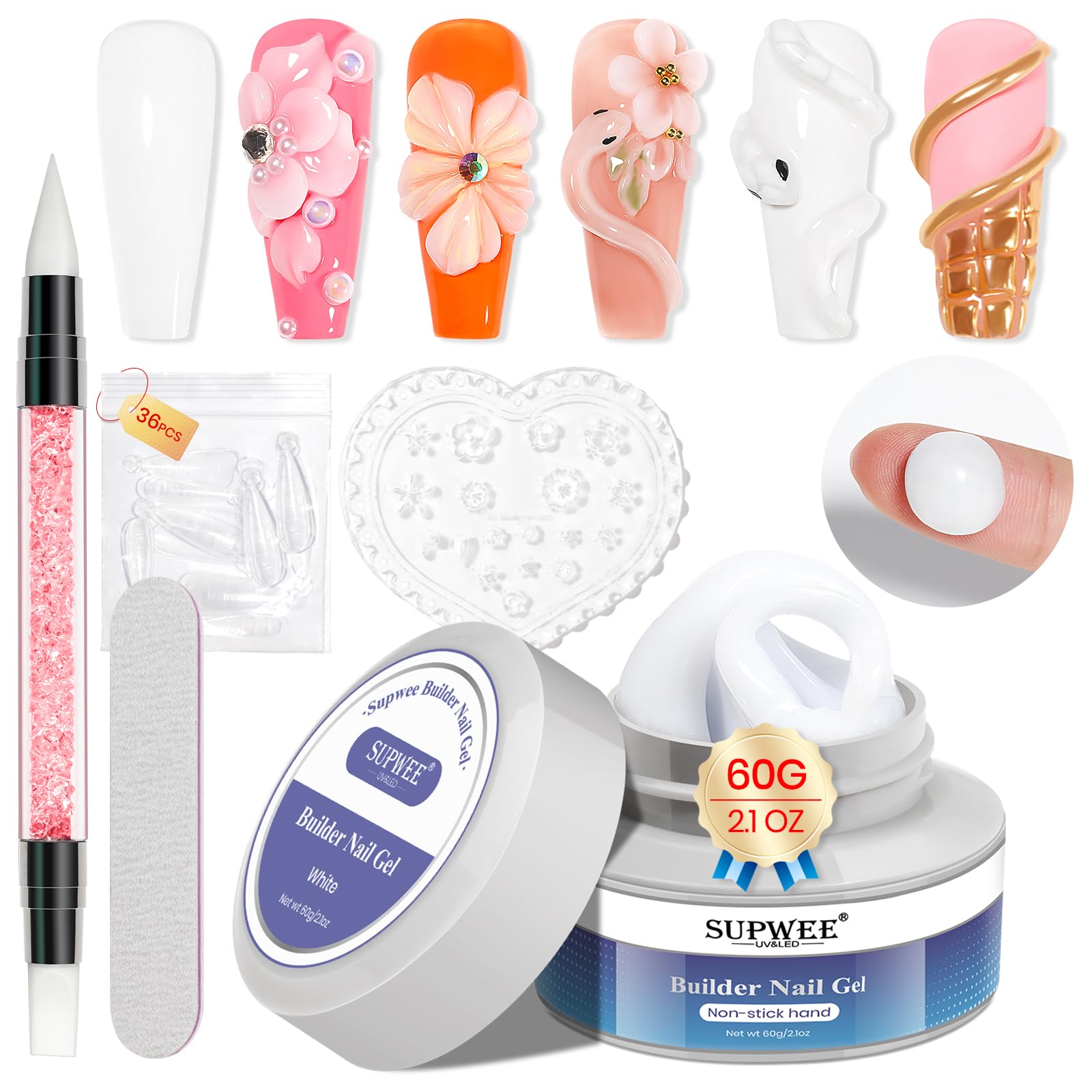 Tips: 1. Please use the glue stick and press the gel onto the nail to form the design. 2. Please use the 3D silicone molds if you find the designs difficult to create on your own. Durable and Smooth: This sculpting gel is made from an upgraded, low-odor, and non-toxic formula. For an easy and enjoyable manicure. With proper nail preparation (filing, buffing, and cleaning), it can last up to 28 days. Easy to Use: This 3D gel is easy to use thanks to its non-runny formula and non-sticky texture. It makes application easy and spreads evenly on the nails. Perfect for professionals and beginners. 5-in-1 Strong Builder Gel: The 3D Nail Art Gel can be used for nail extensions, sculpting, applying decorations, and DIY 3D nail pendants. No clips or other tools are needed. SUPWEE Solid Builder Gel Kit: This solid sculpting gel kit contains one 60g white sculpting gel, one dual-ended silicone pen, one nail buffer, and 36 nail tips. Create stunning nail art designs anytime.