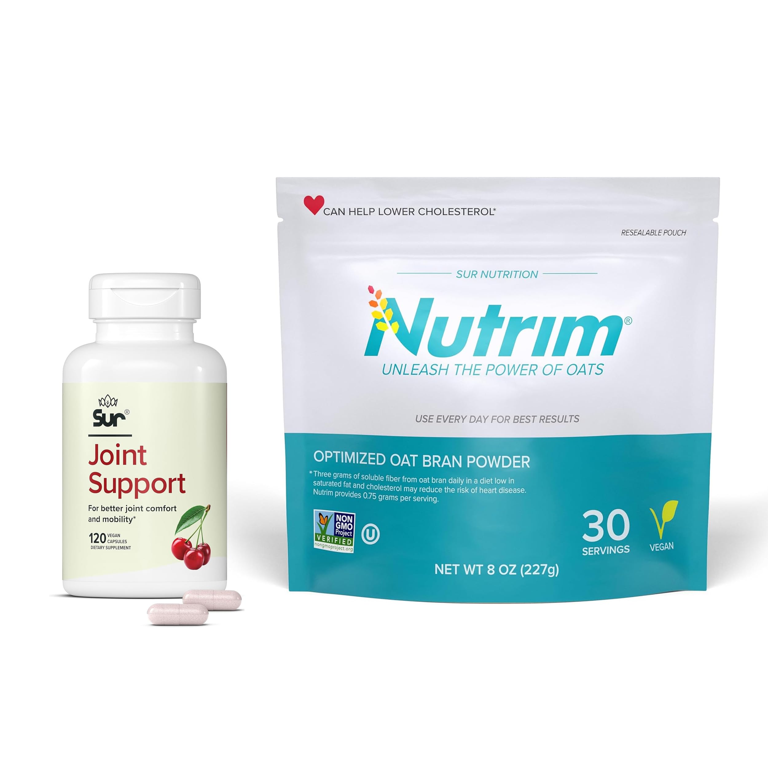 Sur Nutrition is rooted in blending science with 7 generations of Illinois farming heritage, sustained by a commitment to an active lifestyle. We meticulously scrutinize every aspect of product creation from sourcing the best ingredients to using a GMP certified facility. Sustained Benefits: With daily use, expect continuous improvement over time, ensuring your joints stay in prime condition. Fast-Acting Relief: Clinically shown to deliver faster joint comfort than glucosamine and chondroitin. Experience noticeable relief from joint discomfort and stiffness while promoting better mobility. Mix-In Superfood Powder and Cholesterol Management Supplement - Nutrim blends into a wide range of foods and beverages, delivering a concentrated dose of beneficial beta-glucan soluble fiber. Each serving contains 750mg of Oat Beta Glucans, a soluble fiber that helps regulate cholesterol levels and promote overall wellness. As a fine powder designed to readily mix with food and drinks, you can enjoy its heart healthy benefits at any meal. Experience The Power Of Plant-Based Cholesterol Management - Nutrim Oat Bran Power is a vegan-friendly, natural-from-nature alternative to cholesterol medications and their potential side effects. Nutrim is a daily oat fiber supplement that serves as a wholesome substitute for dietary fiber pills, fiber gummies, and other high fiber supplements.