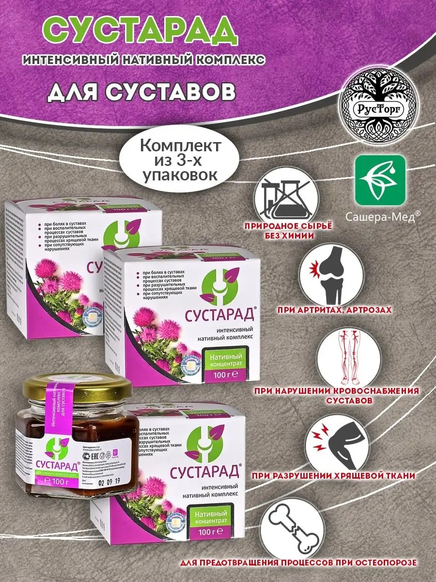 Сустарад концентрат - это комплекс природных компонентов, необходимых для восстановления эпифизов костей сустава, хрящевой ткани позвоночника, коленных, голеностопных и иных суставов. Сустарад концентрат содержит натуральные биологически активные компоненты в мицеллярной форме, способствующей их максимальному усвоению. Благодаря мицеллярной форме продлевается циркуляция активных компонентов в кровотоке, восстанавливая, в свою очередь, клетки ослабленных органов, систем человека.Нативный комплекс Сустарад содержит биоакивные вещества в мицеллярной форме, что повышает проникновение биоактивного комплекса к проблемным зонам сустава при:артритах (ревматоидном, ревматическом и инфекционно-аллергическом полиартрите, спондилоартрите, инфекционно-специфическом, псориатическом полиартрите, болезни Рейтера);дегенеративных артрозах (остеоартрозе, остеохондрозе, спондилёзе, остеохондропатии);сопутствующих изменениях в организме.Разрушение хряща и суставных элементов возникают по разным причинам – нарушение иммунного статуса, гормональный дисбаланс, травма, нарушение обменных процессов, хронические и инфекционные заболевания, в результате возрастных изменений. Суставы, как наиболее активные и подвижные системы человеческого организма подвержены изнашиванию, заболевания суставов неизбежны при наступлении старости.