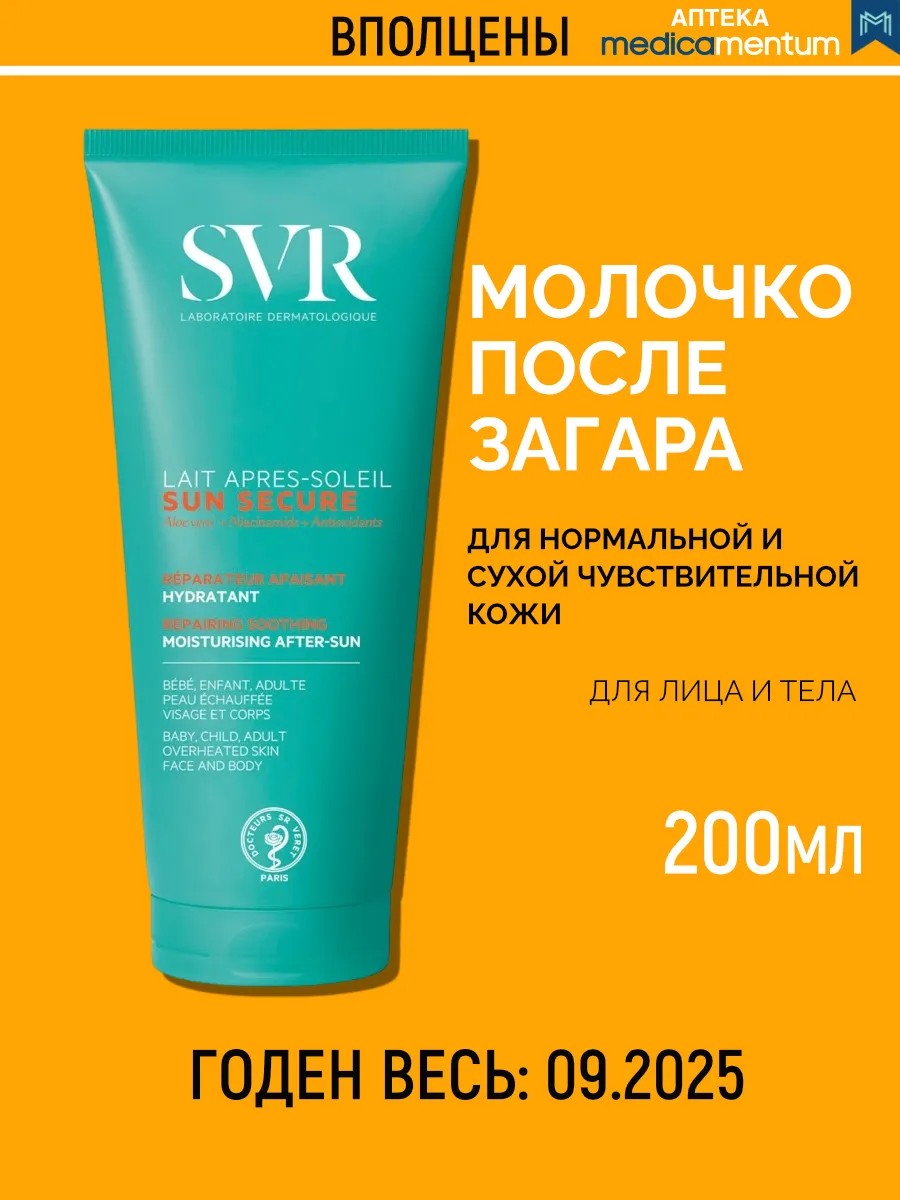 Годен весь сентябрь 2025! СВР САН СЕКЬЮР Молочко после загара 200 мл. Нежное молочко SVR с ниацинамидом и алоэ вера увлажняет, успокаивает и восстанавливает кожу лица и тела после загара. Благодаря комплексу антиоксидантов средство защищает кожу от свободных радикалов, образовавшихся под воздействием ультрафиолета. Молочко также питает кожу, делает её более гладкой и предотвращает появление сухости. Оно тает на коже и быстро впитывается, мгновенно обеспечивая ощущение свежести, успокаивая кожу после солнца и оставляя легкий и приятный летний аромат. Крем после загара подходит для лица и тела.