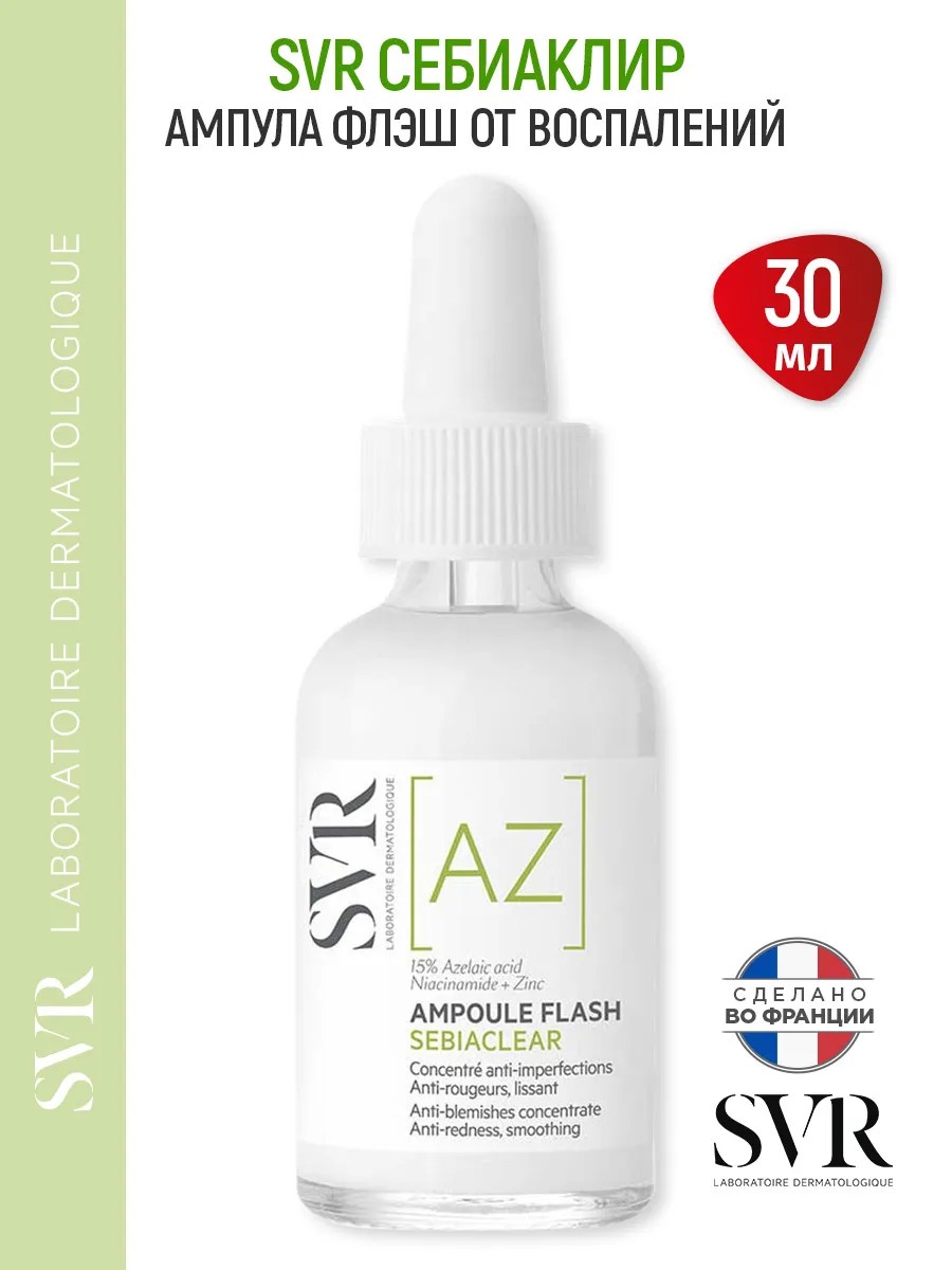 Сыворотка с ниацинамидом от прыщей Себиаклир Ампула Флэш от воспалений СВР Себиаклир (SVR Sebiaclear Flash Vial), 30мл. SVR Себиаклир Ампула Флэш – это сыворотка концентрат от прыщей и воспалительных элементов. Видимый результат через 7 дней применения!