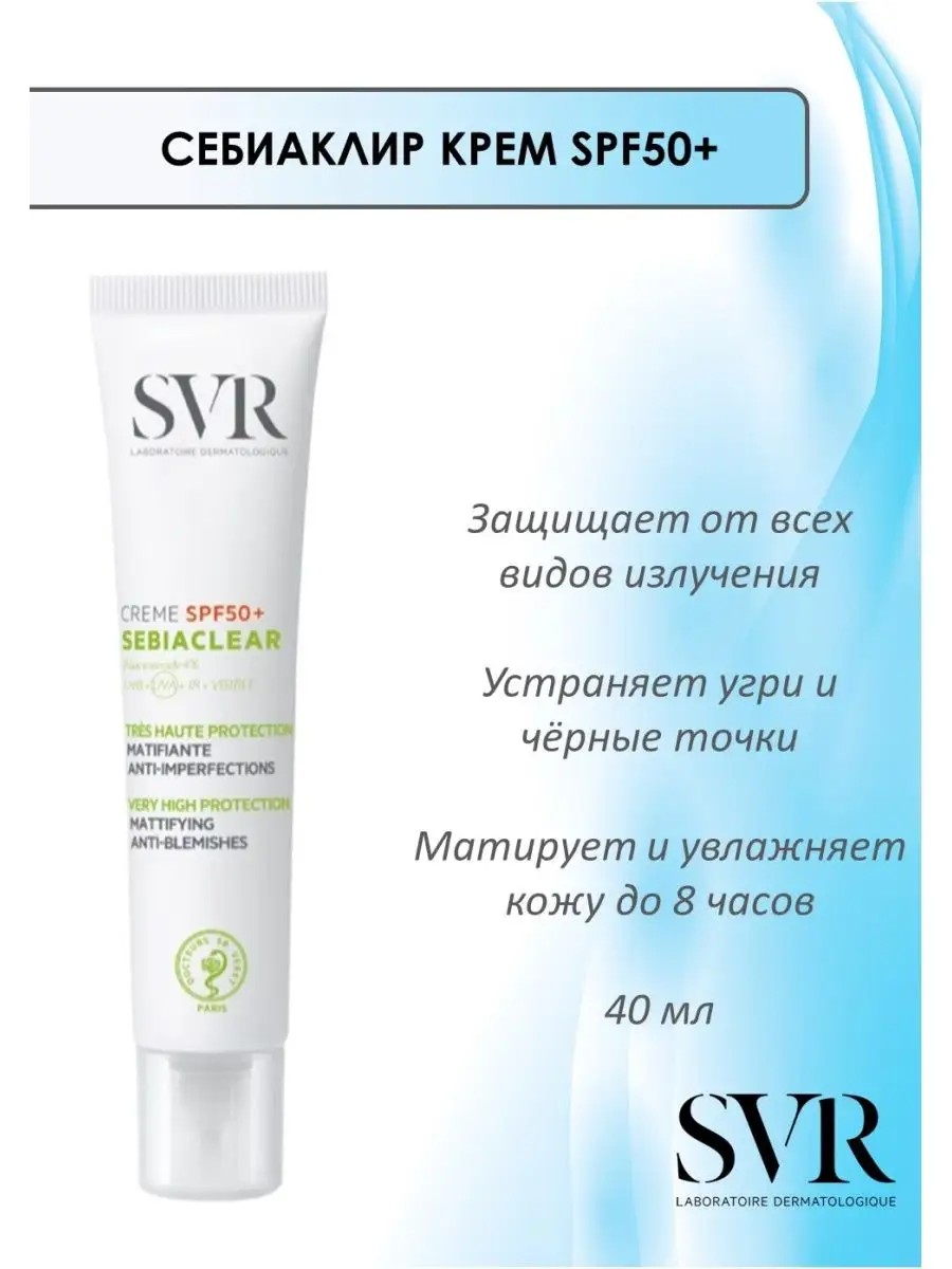 SVR Себиаклир Крем SPF50+ - это дневной крем-уход для чувствительной кожи с тенденцией к акне, обеспечивающий очень высокую защиту от солнца.Защищает от всех видов излученияУстраняет угри и чёрные точкиКорректирует признаки акнеМатирует и увлажняет кожу до 8 часовКрем обладает лёгкой текстурой с приятной отдушкой, быстро впитывается не оставляя белых следов и разводов.Гипоаллергенно. Некомедогенно.Активные компоненты:Ниацинамид- 4% препятствует размножению бактерий, устраняет дефекты кожи, связанные с воспалением; Салициловая кислота обеспечивает кератолитический эффект, выравнивает рельеф, уменьшает проявления постакне;Матирующая пудра устраняет жирный блеск;Новая комбинация солнцезащитных фильтров* обеспечивает защиту от всех лучей UVB + UVA + видимый свет + инфракрасное излучение, предотвращает появление следов постакне и рубцов.