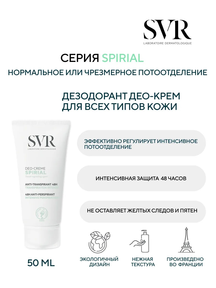 Спириал дезодорант-крем подходит для применения в областях избыточного потоотделения: подмышки, ноги, руки, лицо, складки кожи. Регулирует потоотделение в течении 48 часов и не оставляет следов на одежде.