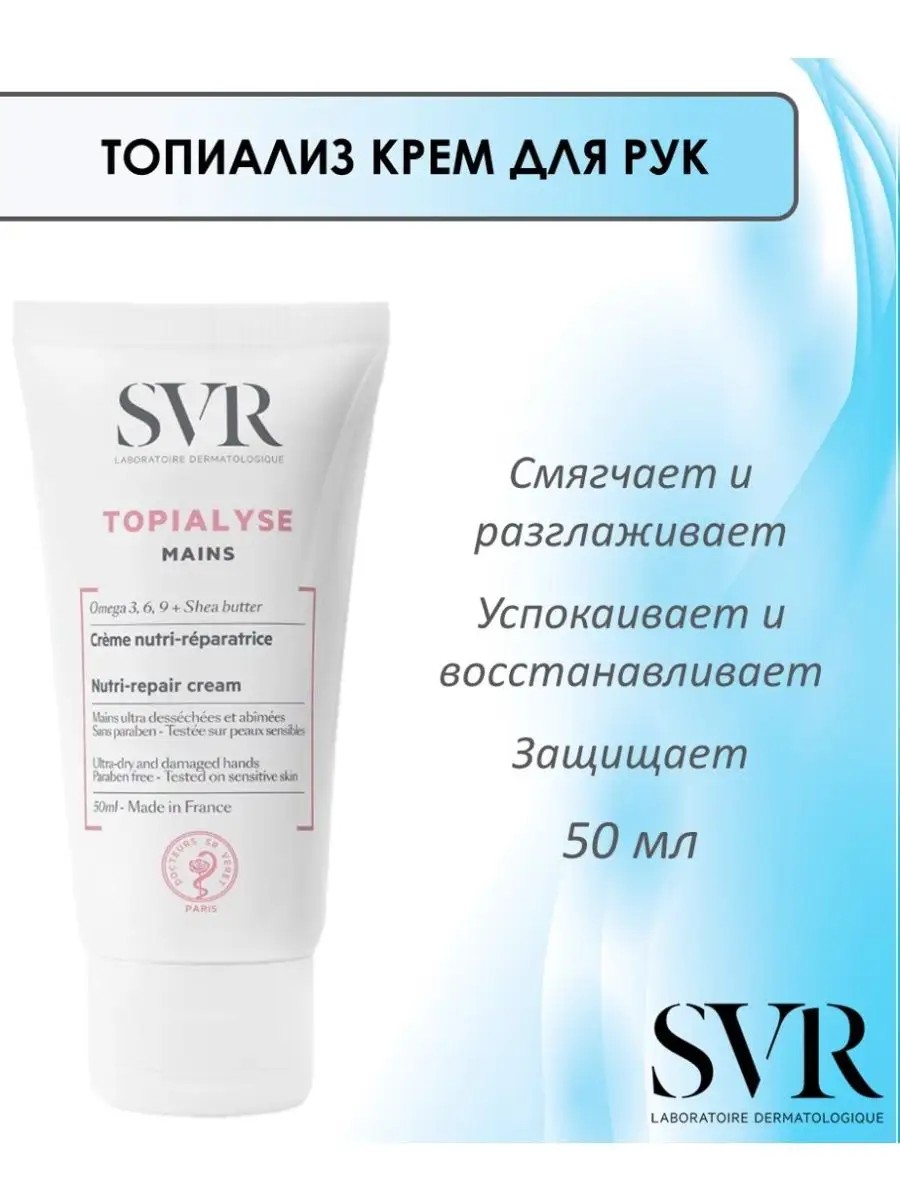 SVR Топиализ Крем для рук - защитный и восстанавливающий крем для поврежденной и сухой кожи рук. Структурированная с помощью жидких кристаллов формула обеспечивает непрерывное и длительное увлажнение. Смягчает и разглаживает. Успокаивает и восстанавливает. Защищает Благодаря легкой текстуре крембыстро впитывается, не оставляя жирной или липкой пленки на коже. Легкий аромат с древесными и фруктовыми нотами не вызывает аллергии.Без минеральных масел, без парабенов, без силикона, гипоаллергенно.Протестированна сухой коже с тенденцией к атопии. Активные компоненты: масло камелии (Омега 3,6,9) -смягчает и питает кожу; масло карите -восстанавливает гидролипидный баланс и возвращает коже комфорт; глицерин, инкапсулированный в форму «жидких кристаллов» - пролонгированное увлажнение.