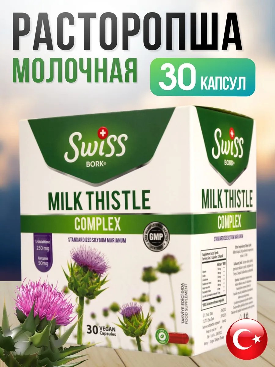 Milk Thistle capsules from the Turkish brand Swiss Bork are high-quality dietary supplements developed using a combination of natural and herbal ingredients. This hepatoprotector helps prevent liver disease and maintains liver health. Silymarin, the main active ingredient in this complex product, reduces levels of harmful free radicals, protecting liver cells from damage. It improves metabolism, digestion, and liver function, and has a positive effect on the gallbladder and pancreas. Choline, also known as vitamin B4, breaks down fats and helps cleanse (detoxify) the body in both men and women. L-glutathione helps boost immunity. Dandelion extract is known for its diuretic and choleretic properties, reducing the level of toxins and waste. Ginger has anti-inflammatory and decongestant properties. Phosphatidylcholine, contained in the dietary supplement, helps with the absorption of nutrients. Curcumin fights inflammation. Milk Thistle is ideal for those who care about themselves. This dietary supplement is suitable for adult men, women, and the elderly. Tablets, unlike oil, are easy to use and transport. This herbal preparation is not a medicine. It is an excellent addition to any person's healthy diet. Before taking any multivitamins or dietary supplements, consult a doctor. Contraindications include individual intolerance, pregnancy, and breastfeeding.