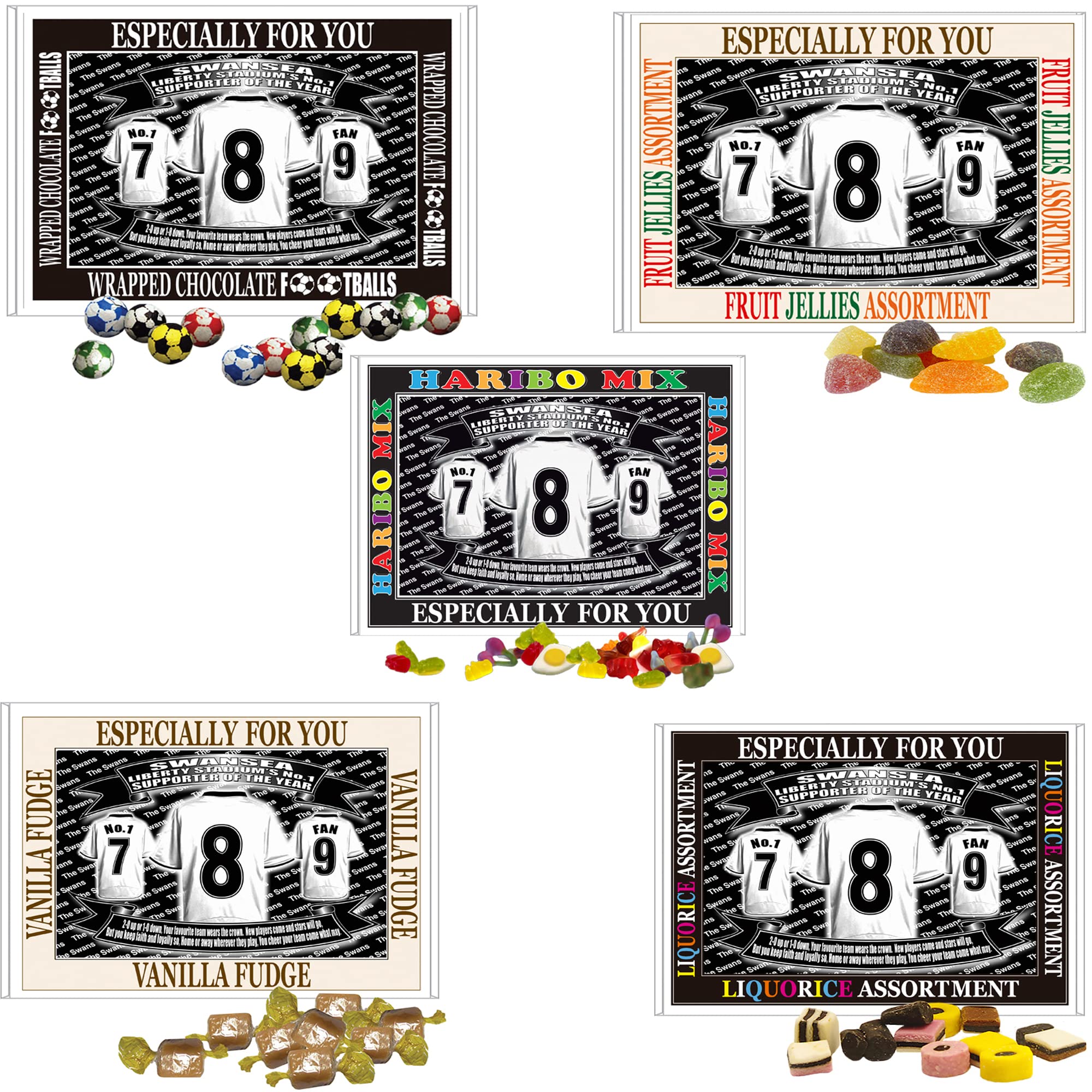 A perfect gift for any avid SWANS FAN. Your favourite football team's shirt image printed onto a box lid containing 200g of your favourite sweets. Ingredients: LIQUORICE ASSORTMENT: Sugar, treacle, wheat flower , glucose syrup, desiccated coconut, vegetable oil, beef gelatine, cornflower, humectant, glycerol, natural colours, plain caramel, beetroot red, curcumin, anthocyanins, capsanthin, fat-reduced cocoa powder, liquorice powder, flavourings, glazing agent. Fruit and vegetable concentrates: Blackurrant, carrot and radish. This product contains wheat. VANILLA FUDGE Assortment Sugar, glucose syrup, full cream condensed milk (milk sugar), vegetable oils (palm kernel palm stearin oil), butter (milk), salt, emulsifier: soya lecithin flavourings. This product may contain egg and nut traces. FRUIT JELLIES ASSORTMENT: Sugar, glucose syrup, water, gelling agent, pectin acid: lactic acid flavourings. Colours: Anthocyanins. Chlorophylls, curcumin, capsanthin. This product may contain nuts, milk, sesame seeds and gluten. CHOCOLATE BALLS Ingredients: Sugar, vegetable oil (palm kernel), whey powder (milk), reduced fat cocoa powder, sorbitan tristearate, soya lecithin, natural bourbon vanilla. Allergens: Milk Soya. FRUIT GUMMIES MIX Sugar, Glucose syrup, dextrose, spirulina, starch, gelatine, acid, citric acid, palm fat, watergelatine, caramelised sugar syrup, flavouring fruit and plant concentrates apple, aronia, blackcurrant, elderberry, grape, kiwi, lemon, mango, nettle, orange, carrot, passion fruit, spinach glazing agents: beeswax carnauba wax, palm fat, water gelatine, colour: copper complexes to chlorophyll, invert sugar syrup elderberry extract, carob extract Any image or text displayed on this unofficial product has been independently produced and is in no way connected with, or endorsed by, the personalities, people, agents or organisations they may appear to depict. INGREDIENTS Liquorice Assortment Sugar, treacle, wheat flower , glucose syrup, desiccated coconut, vegetable oil, beef gelatine, cornflower, humectant, glycerol, natural colours, plain caramel, beetroot red, curcumin, anthocyanins, capsanthin, fat-reduced cocoa powder, liquorice powder, flavourings, glazing agent. Fruit and vegetable concentrates: Blackurrant, carrot and radish. This product contains wheat. Vanilla Fudge Assortment Sugar, glucose syrup, full cream condensed milk (milk sugar), vegetable oils (palm kernel palm stearin oil), butter (milk), salt, emulsifier: soya lecithin flavourings. This product may contain egg and nut traces. Fruit Jellies Assortment Sugar, glucose syrup, water, gelling agent, pectin acid: lactic acid flavourings. Colours: Anthocyanins. Chlorophylls, curcumin, capsanthin. This product may contain nuts, milk, sesame seeds and gluten.Manufactured in the UK. Supporting UK Small Businesses. Perfect Gift for Any Occasion.