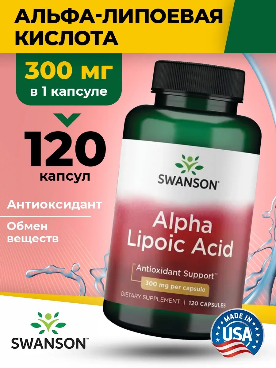 Свансон, Альфа-липоевая кислота, 300 мг, 120 капсул, Swanson, Alpha Lipoic Acid, Antioxidant, 300 mg, 120 Capsules – это высококачественная биологически активная добавка, которая является источником альфа-липоевой кислоты. Натуральный продукт без применения компонентов животного происхождения, ГМО и консервантов. Сбалансированный состав обеспечивает продолжительное положительное действие. Альфа-липоевая кислота обладает мощным антиоксидантным действием. Позволяет нейтрализовать на клеточном уровне разрушительное влияние свободных радикалов. Помогает замедлить процесс старения клеток и ускоряет их восстановление после повреждений. Alpha lipoic acid (ALA) – это уникальный продукт, разработанный специально для тех, кто стремится к идеальной фигуре, здоровой коже и высокому уровню энергии. Также способствует поддержанию уровня сахара в крови в здоровом диапазоне. Кроме того, альфалипоевая кислота АЛК помогает замедлить процесс старения, делая вашу кожу более упругой, молодой и сияющей. Способствует производству глутатиона в организме человека, улучшает усвоение витаминов Е и С, стимулирует жировой обмен и ускоряет жиросжигание. Жиросжигатель АЛК помогает снижению веса, похудению и улучшению рельефа тела. При этом, поддерживает здоровое антистресс состояние нервных клеток и оказывает поддержку сердечно-сосудистой системе. Также способствует очищению и защите клеток печени от шлаков и токсинов, оказывая детокс detox эффект. Благодаря ей, в организме запускается профилактика заболеваний кровеносных сосудов. Альфа липоевая кислота защищает от свободных радикалов клетки головного мозга, улучшает память и концентрацию внимания. Способствует уменьшению утомляемости и тревожности, даруя спокойный сон. Защищает сердце, снижает уровень триглицеридов и «плохого» холестерина в крови. Это натуральный препарат Swanson предназначен для взрослого мужского и женского организмов. Набор капсул содержит ультра мощные и эффективные средства, которые помогают комплексно поддерживать диету, правильное питание и контроль баланса организма. Этот витаминный комплекс разработан специально для поддержания роста иммунитета, восстановления здоровья и красоты, у людей различных возрастных групп. Превосходная формула внутри баночки, основа для поддержания ultra balance и высокой энергии в организме, необходимой для активной жизни и спортивной тренировочной формы. Полезная биодобавка подходит для сильных спортсменов, диетического и спортивного пит (спортпит). Alpha Lipoic Acid – это незаменимый помощник для мужчин и женщин, которые стремится к здоровому образу жизни, активному спорту и быстрому повышению бодрости. ПРИМЕНЕНИЕ: Принимать по одной (1) капсуле один-два раза в день во время еды и воды. ПРЕДУПРЕЖДЕНИЕ: Проконсультируйтесь с врачом перед применением пищевых добавок, если вы проходите курс лечения от какого-либо заболевания, а также в период беременности и лактации.