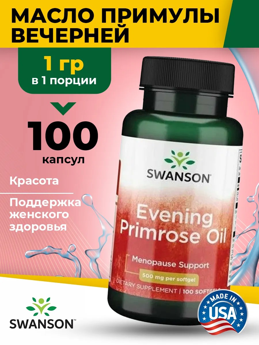 Swanson Evening Primrose Oil 500 mg, 100 Softgels is a natural, effective remedy for supporting women's health, beauty, and well-being at different stages of life. Each softgel contains 500 mg of cold-pressed evening primrose oil. It is rich in essential unsaturated fatty acids—in particular, linoleic (LA) and gamma-linolenic (GLA) acids, compounds belonging to the omega-6 polyunsaturated fatty acid group. This dietary supplement provides comprehensive support for women's health and strengthens the immune system. It maintains healthy and beautiful skin, leaving it soft and elastic. It relieves facial inflammation and is effective for acne, eczema, and atopic dermatitis. It regulates the secretion of hormones, including estrogen and testosterone. Relieves pain and inflammation, helping with PMS and menopause. It stabilizes hormonal balance in women and increases fertility. It improves cardiovascular function and stabilizes blood pressure. It normalizes the central nervous system and brain function, and has a calming effect. Evening primrose helps thin the blood and prevent blood clots. It protects against viruses and bacteria. It helps control appetite and stimulates fat burning, promoting weight loss. It is used to prevent cardiovascular disease and improve memory and brain function. Thanks to its fat content, it stops hair loss, combats dry scalp, and soothes irritation. It also helps with excess weight and hot flashes during menopause. It helps strengthen nails and muscle mass. These super vitamin capsules are a true super product for maintaining health and fitness. Those with diabetes need evening primrose oil to enrich their diet with vitamins and PUFAs. This natural supplement is designed for adult men, women, and girls. This capsule set supports proper nutrition and balance. This vitamin complex is specifically designed to boost immunity, restore health, and improve beauty. The superior formula inside the jar is suitable for strong athletes, dietary, and sports nutritionists. This professional supplement will maintain nutrient balance and increase energy throughout the day. It will become an indispensable assistant for anyone striving for a healthy lifestyle and enjoying its benefits. Evening Primrose Oil is the secret to women's health and good mood! Directions: Take 2 softgels 2-3 times daily with meals and water. WARNING: Consult a physician before using dietary supplements if you are undergoing treatment for any medical condition, or if you are pregnant or breastfeeding. Keep out of reach of children. This is not a medicine.