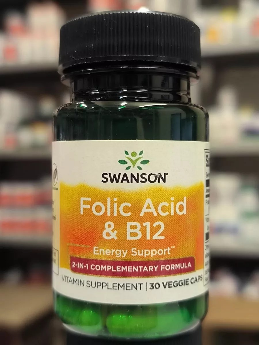 Swanson Folic Acid & B12 is a dietary supplement containing folic acid and vitamin B12.