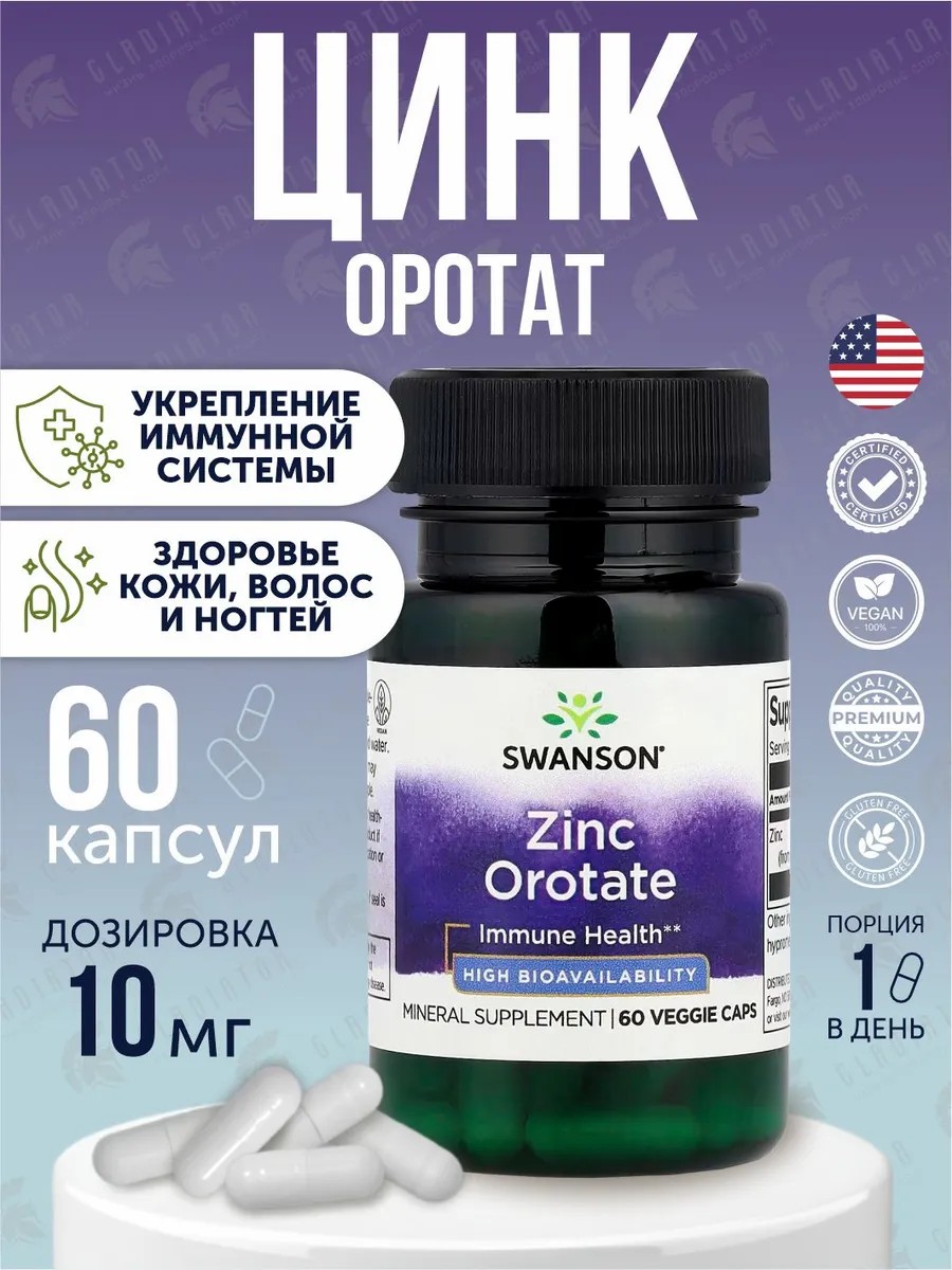 Swanson Zinc Orotate, 10 мг — содержит цинк в форме оротата , которая отличается высокой биодоступностью и мягким действием на организм.