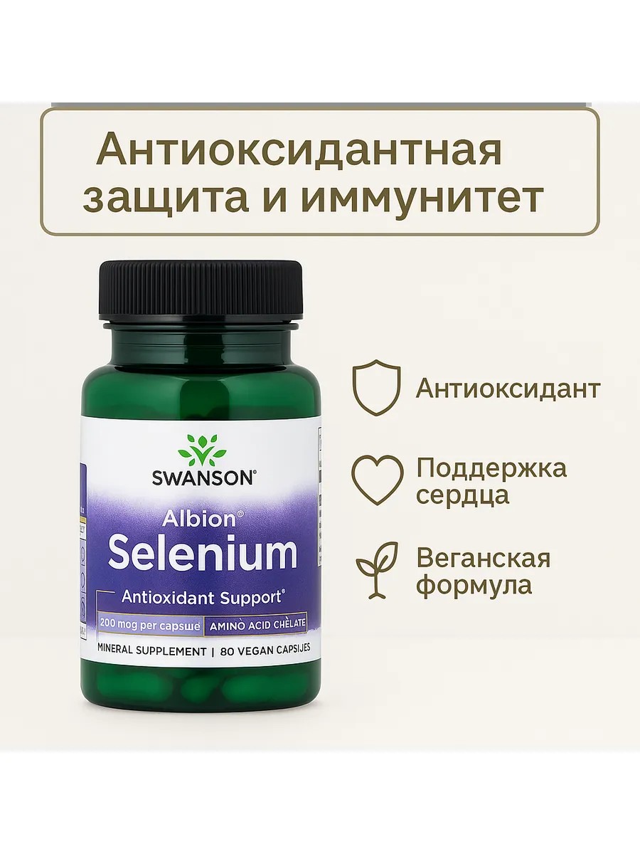 Swanson Albion Selenium 200 мкг — растительные капсулы с высокобиодоступной хелатной формой микроэлемента для комплексной антиоксидантной поддержки, нормальной работы щитовидной железы и укрепления иммунной защиты. Одна порция содержит 200 мкг элементного селена в форме Albion, что способствует эффективному включению в селенопротеины, включая глутатион-пероксидазы и тиоредоксин-редуктазы, снижению окислительного стресса и защите липидных мембран. Достаточное поступление улучшает периферическое превращение тироксина в трийодтиронин, поддерживает устойчивость к инфекционным нагрузкам, способствует сохранению когнитивных функций, сперматогенеза и нормального состояния волос и ногтей. Формула создана без глютена и ГМО, подходит для веганского рациона, выпускается в условиях GMP с лабораторным контролем чистоты и соответствия дозировке. Рекомендуется принимать по одной капсуле в день во время еды; длительное применение целесообразно согласовывать со специалистом, учитывая суммарное поступление из продуктов и других добавок. Существенно превышать суточное потребление нельзя: верхний безопасный уровень для взрослых составляет 400 мкг, а избыток может проявляться металлическим привкусом, ломкостью ногтей, выпадением волос и желудочно-кишечным дискомфортом. Оптимально сочетать с витамином Е и витамином С как частью антиоксидантной сети; при приёме тиреоидных гормонов, антикоагулянтов или наличии хронических состояний необходима предварительная консультация. Препарат предназначен для взрослых, хранить в сухом месте при комнатной температуре, не использовать как замену разнообразного питания.