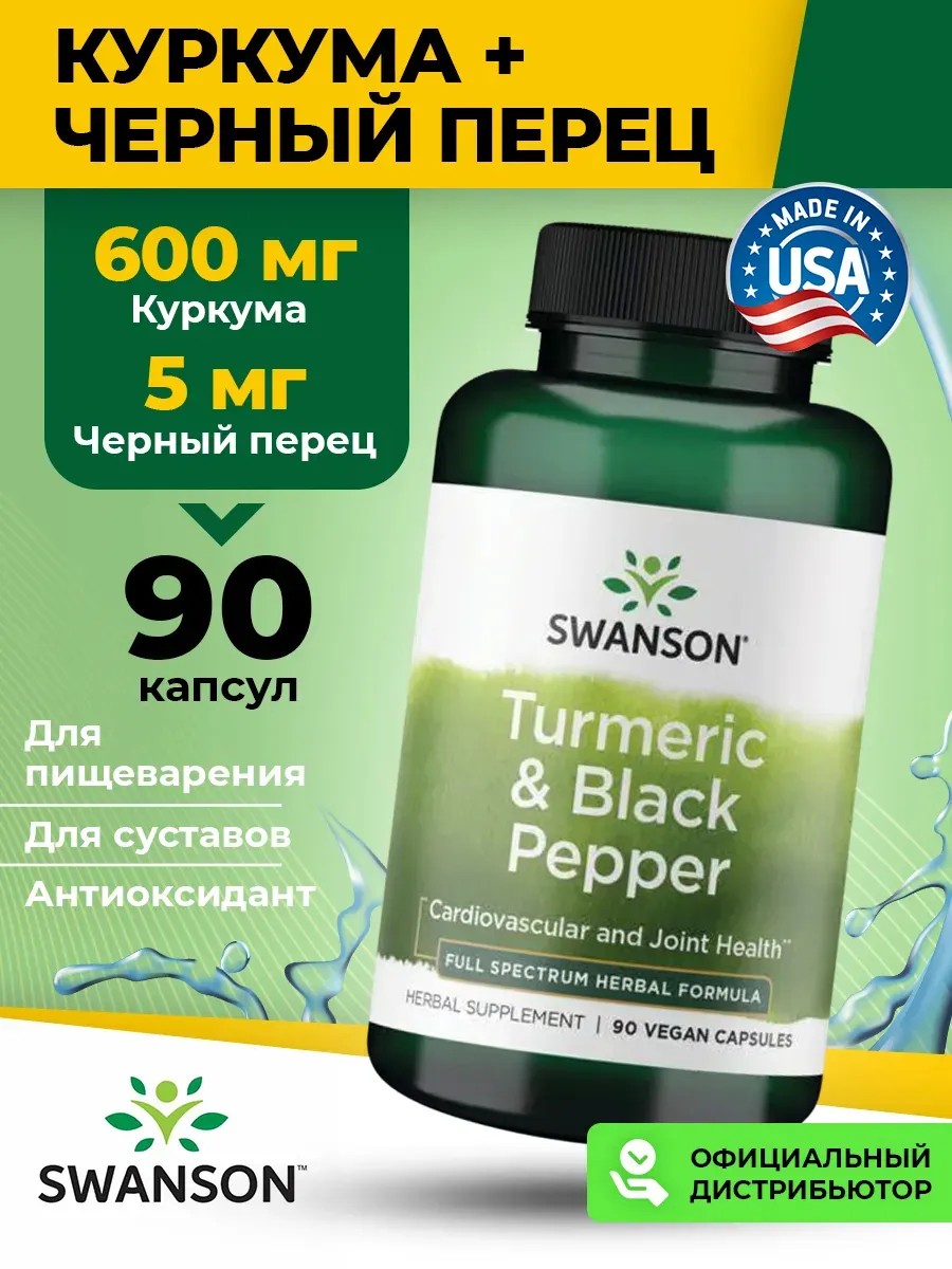 Свансон, Куркума и черный перец, 90 растительных капсул, Swanson, Turmeric & Black Pepper, 90 Veggie Capsules. Биологически активная добавка в форме капсул на основе растительных экстрактов куркумы и черного перца. Предназначена для людей, желающих дополнить свой ежедневный рацион ценными соединениями. Куркумин – это природное химическое соединение, получаемое из специи, известной как куркума. Куркумин положительно влияет на жировой обмен и уровень холестерина в крови, поддерживает пищеварение и функцию печени. Также он эффективно уменьшает артериальное давление за счет противовоспалительных свойств. Черный перец содержит пиперин, вещество, которое увеличивает усвоение куркумина. Пиперин помогает улучшить пищеварение, также способствует усвоению некоторых витаминов и минералов, например селен, vitamin витамины группы В и бета-каротин. Комплекс поможет ускорить метаболизм и эффективно поддерживает процесс термогенеза. Улучшает физическую форму тела. Обладает антибактериальным и противовирусным и антиоксидантным действиями. Благотворно влияет на пищеварительную систему. Это помогает уменьшить проблемы с желудком, поддерживая правильное пищеварение. Способствует здоровью сердца и сосудов; суставов и связок, укреплению кожи, волос и ногтей. Как жиросжигатель снижает аппетит и тягу к сладкому, способствуя похудению, снижению веса и стройности. Способствует улучшению памяти, стимулирует умственную деятельность, ускоряет обновление клеток мозга, а также повышает уровень серотонина и дофамина, которые напрямую влияют на хорошее настроение. Это вещество плохо всасывается в ЖКТ, поэтому эффективно в борьбе с воспалительными заболеваниями кишечника. Это натуральный препарат, который предназначен для взрослых мужчин и женщин, юношей и девушек. Набор капсул содержат эффективные средства, которые помогают комплексно поддерживать детокс диету и правильное питание. Этот витаминный комплекс разработан специально для поддержания роста иммунитета. Превосходная формула внутри баночки, подходит для сильных спортсменов, диетического и спортивного пит (спортпит). Мужские и женские профессиональные пищевые добавки, помогут вам поддерживать баланс питательных веществ plus увеличения энергии на целый день. Это незаменимый помощник для всех, кто стремится к здоровому образу жизни, активному спорту и крепкому имунитету. С биодобавкой вы приведите в норму свой образ жизни и будете наслаждайтесь плюсами этого подарка для организма. ПРИМЕНЕНИЕ: Принимайте порцию продукта (2 таблетки) один раз в день, запивая водой. Не превышайте 1 порцию в день (2 таблетки). ПРЕДУПРЕЖДЕНИЕ: Проконсультируйтесь с врачом перед применением пищевых добавок, если вы проходите курс лечения от какого-либо заболевания. Продукт не следует использовать детям, беременным женщинам и кормящим матерям.