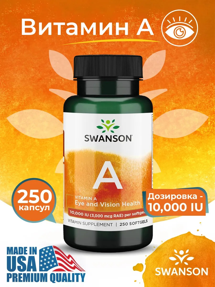 **Swanson Витамин А** (10.000 МЕ) в гелевых капсулах Важен для зрения и иммунитета, а также для здоровья кожи, волос и костей. Ретинол (витамин А) обеспечивает мощную антиоксидантную защиту всего тела. Содержит витамин А из жира печени трески. Для здоровья глаз, кожи и иммунной системы попробуйте Swanson Vitamin A. Полученный из жира печени рыб и витамина А пальмитатен обеспечивает мощную антиоксидантную защиту для всего тела. Гелевые капсулы, которые легко глотать.