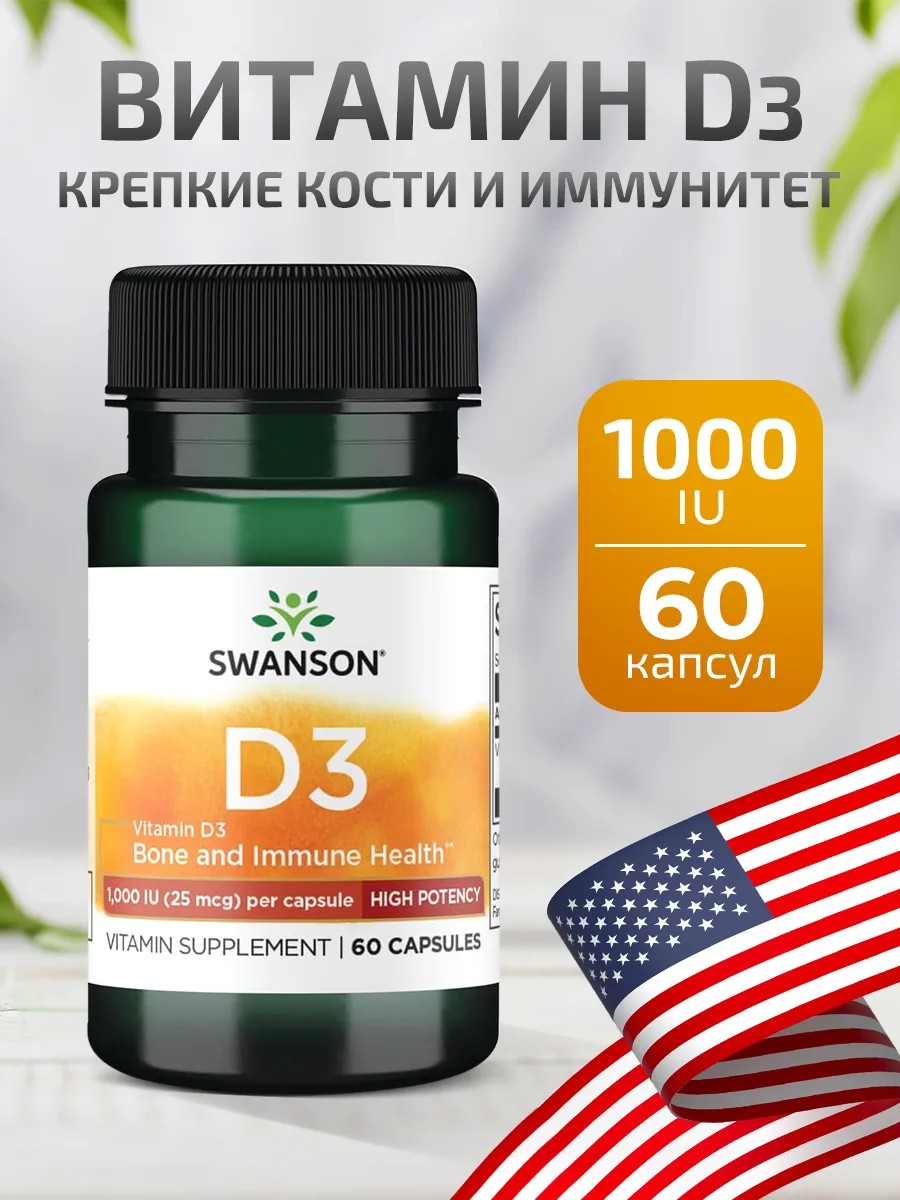 | Комплектация | 1 банка Swanson, Витамин D3, 25 мкг (1000 МЕ), 60 капсул |