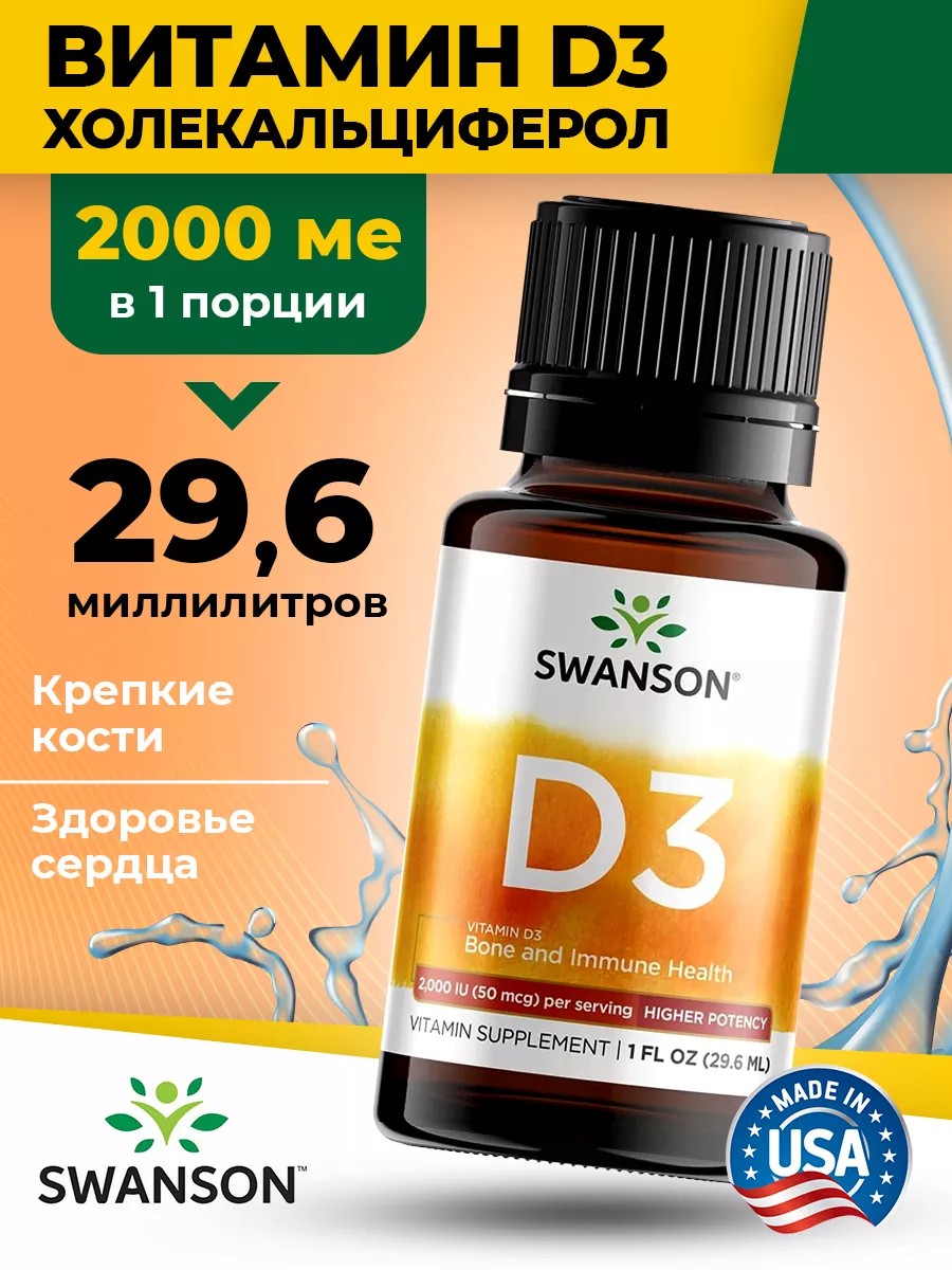 Свансон, Витамин D3, высокая эффективность, 2000 МЕ (50 мкг), жидкие капли 1 унция (29,6 мл), Swanson, Vitamin D3 - High Potency 2,000 IU (50 mcg), 1 fl oz Liquid Drops – это высококачественная биологически активная добавка, которая является источником витамина D3. Витамин D, содержащийся в продукте, обеспечивает здоровое состояние костей и зубов, правильное функционирование мышц, а также способствует правильному функционированию иммунной системы. Кроме того, он способствует правильному усвоению и утилизации кальция и фосфора, а также поддержанию необходимого уровня кальция в крови. Данное вещество принимает участие в процессе деления клеток. Жидкая биодобавка полна питательных веществ, которые могут быть особенно полезными для взрослых мужчин и женщин. Vitamin D3, также известный как холекальциферол, это натуральный витаминный комплекс также может быть полезен для спортсменов и любителей спортивных активностей, так как он помогает улучшить производительность и роста выносливости во время тренировок. Капли Vitamin D3 также могут быть полезны для девушек. Они помогают поддерживать здоровье и красоту, волос и ногтей, сохранять кожу в хорошем состоянии и усиливают иммунитет. Прием жидкого препарата также может способствовать улучшению памяти и зрения, состояния сердца и сосудов, а также против развития простуды. Витамин д3 поможет снизить риск ожирения. Биодобавка для похудения позволяет заботиться о здоровье своего организма и получать все необходимые питательные вещества. Превосходная формула обеспечит мужской и женский организм всеми необходимыми веществами для поддержания баланса и энергии. Этот витаминный complex также может быть полезен для групп людей, страдающих от стресса или проблем со сном. Vitamin D3 – это натуральное средство для поддержки здоровья, которое необходимо включить в повседневное питание. Этот комплексный продукт поможет поддерживать здоровье суставов и связок, улучшать память и мозговую функцию. Он также может быть полезным для людей, стремящихся контролировать вес и набор массы. Не упустите возможность обрести счастье и здоровье с помощью противовоспалительного и иммуномодулирующего комплекса Vitamin D3. Эффективные капли Swanson с уникальной формулой помогут достичь активного образа жизни и улучшить ваше физическое и эмоциональное состояние. ПРИМЕНЕНИE: принимать по пять капель во время еды один раз в день или по назначению врача. Можно добавлять в еду или смешивать с другими жидкостями, такими как вода или сок. Перед каждым применением хорошо взболтать. ПРЕДУПРЕЖДЕНИЕ: Проконсультируйтесь с врачом перед применением пищевых добавок, если вы проходите курс лечения от какого-либо заболевания, а также в период беременности и лактации.
