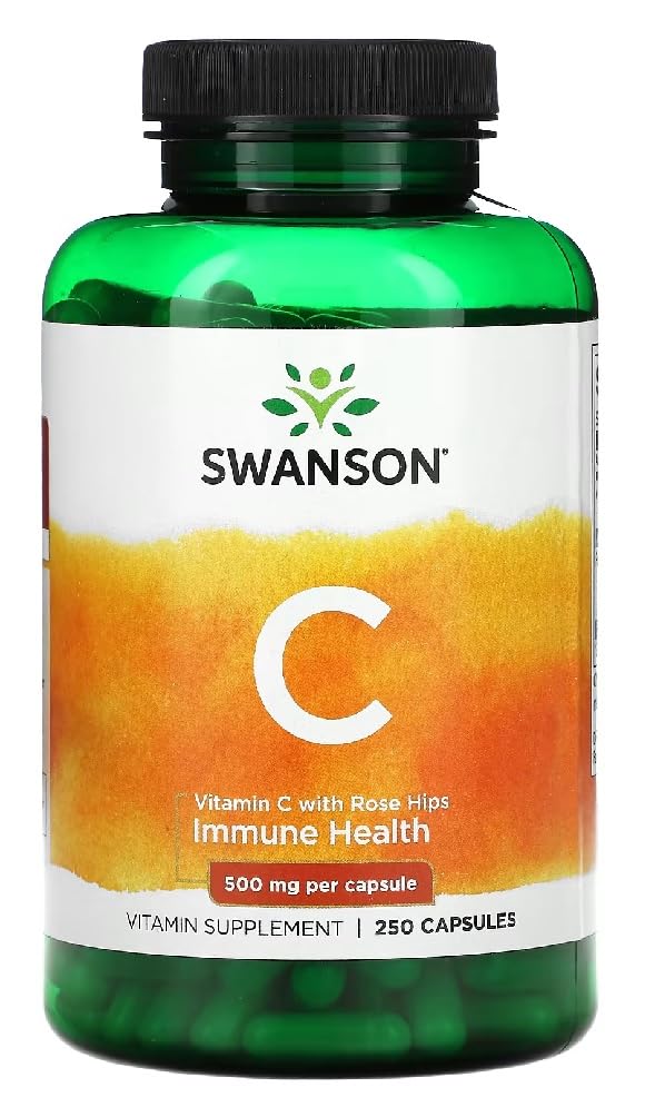 : Swanson's Vitamin C with Rosehip is an essential supplement to support your immune system and provide powerful antioxidant protection. Formulated with pure vitamin C and rosehip, this combination promotes optimal absorption and helps protect cells from oxidative damage. Ideal for those looking to maintain good overall health, this supplement is easy to incorporate into your daily routine. Take one capsule daily to enjoy the benefits of vitamin C while boosting your natural immunity. Each bottle contains 250 capsules, providing a long-lasting supply for your well-being. Ingredients and nutritional values per daily dose (1 capsule): Vitamin C (as ascorbic acid) (500 mg) (556 ), Rosehip extract 4:1 (equivalent to 50 mg of rosehip powder) (12.5 mg) Directions: As a dietary supplement, take one capsule daily with food and water. Safety Warning: For adults only. If you are pregnant or breastfeeding, taking medication, or have a medical condition, consult your doctor before taking this product. Dietary supplements should not replace a balanced and varied diet. Do not exceed the recommended daily dose. Keep out of reach of children. store in a cool, dry place. See more