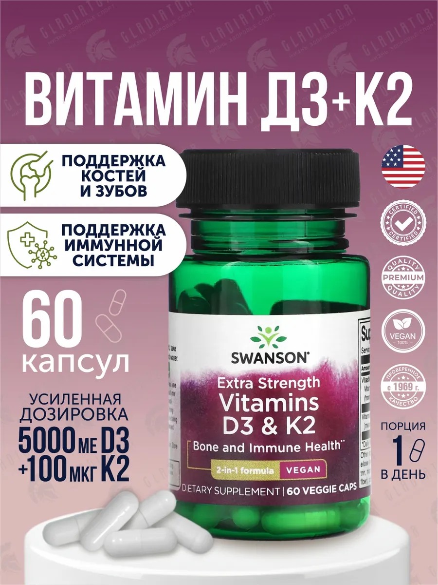 Swanson Extra Strength D3 & K2 — это эффективный комплекс для тех, кто заботится о здоровье костей, сердца и общем тонусе организма.