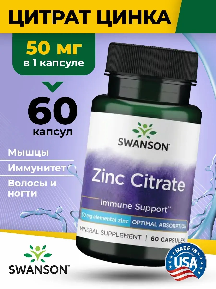 swanson Цинк цитрат 50 мг Zinc Citrate для иммунитета, 60 кaпсул