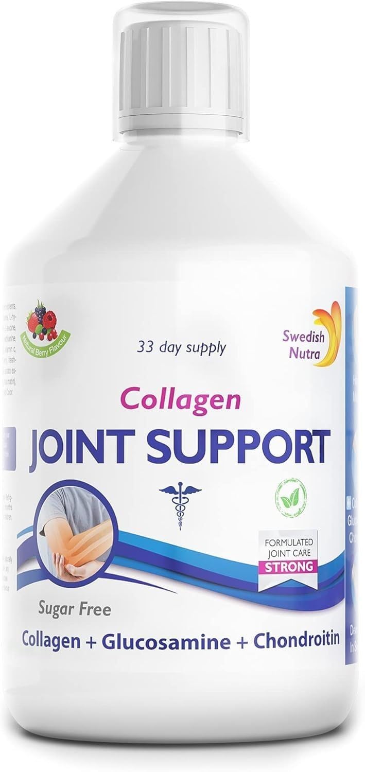SWEDISH NUTRA COLLAGEN JOINT SUPPORT SUGAR FREE (500 ML) – LIQUID COLLAGEN FORMULA FOR JOINTS Swedish Nutra Collagen Joint Support Sugar Free is a liquid collagen supplement with natural berry flavor, developed as daily support for joints, cartilage and bones. The formula combines hydrolyzed collagen type II with important vitamins, minerals, MSM and a Joint Blend with glucosamine and chondroitin. Collagen type II occurs naturally in connective tissue and cartilage. This supplement fits perfectly into an active lifestyle and offers a practical, easily absorbable form of daily support without added sugars. KEY BENEFITS 5,000 mg hydrolyzed collagen type II per 15 ml serving. Joint Blend (1,000 mg): Glucosamine chondroitin – well-known ingredients for joint support. MSM: Widely used in supplements for muscles and joints. With vitamin C D3: Vitamin D supports the maintenance of normal bones vitamin C contributes to normal collagen formation. With turmeric, green tea ginseng: Traditional plant extracts within wellness supplements. 100 natural berry flavor – completely sugar-free, gluten-free and lactose-free. 500 ml bottle: Sufficient for approx. 33 days at 15 ml per day. USE Recommended dosage: 15 ml per day, taken directly or mixed with water. Shake well before use. Do not exceed recommended daily allowance. IMPORTANT INFORMATION Dietary supplement not a substitute for a varied diet and healthy lifestyle. Not recommended for individuals taking blood thinners such as warfarin. Keep out of the reach of children. Keep refrigerated after opening and consume within 2 months. Ingredients of bovine collagen. Collagen Joint Support Sugar Free – practical daily support for bones and joint structure. INGREDIENTS Ingredients: Multifiltered water, hydrolyzed collagen type 1,2 3 (contains the amino acids: L-glycine, L-proline, L-alanine, L-hydroxyproline, L-glutamic acid, L-arginine, L-aspartic acid, L-serine, L-lysine, L-leucine, L-valine, L-threonine, L-phenylalanine, L-isoleucine, L-hydroxylysine, L-methionine, L-histidine, L-tyrosine, L-cysteine), acidity regulator (citric acid, malic acid, phosphoric acid), glucosamine, chondroitin, methylsulfonylmethane, L-carnitine, vitamin C, flavor (natural fruit), color (natural purple potato extract), freshness preservative (potassium sorbate, sodium benzoate), sweetener (sucralose, ace k, steviol glycosides), vitamin D3, emulsifier (xanthan gum), turmeric powder, green tea powder, vitamin B12. 100 natural taste and natural color. INSTRUCTIONS FOR USE for adults 15 ml daily in the supplied measuring cap SAFETY WARNING Non-GMO and free of wheat, gluten, soy, egg, nuts and milk. If you have a medical condition or are pregnant or nursing, consult your healthcare provider before using the product. Discontinue use if adverse reactions occur. Dietary supplements should not replace a varied diet. Store cool. Keep out of the sun. Store in the refrigerator after opening. Use within 2 months after opening. Keep out of reach of children. Free from sugar. Contains sweetener. Caffeine (1 mg per serving). This product contains 2 mg (-)-epigallocatechin-3-gallate (EGCG) per green tea serving. The daily intake should not exceed 800 mg EGCG. Do not use in combination with other products containing green tea on the same day. Not suitable for pregnant or breastfeeding women or children under 18 years of age. See moreEveryday Comfort: Supports joint mobility and flexibility for an active lifestyle. Optimal Absorption: Liquid form ensures quick and effective absorption of nutrients by the body. Delicious Taste: Refreshing berry flavor makes daily intake pleasant and easy. Sugar-Free Formula: Healthy nutritional support without added sugar, perfect for people who want to limit their sugar intake. Joint Support: Liquid supplement specially formulated to relieve joint pain and promote cartilage's natural repair processes.Swedish Nutra's Joint Support sugar free is een vloeibaar supplement met bessensmaak, speciaal ontwikkeld om gewrichtspijn te verlichten en kraakbeenherstel te ondersteunen. SWEDISH NUTRA COLLAGEN JOINT SUPPORT SUGAR FREE (500 ML) – VLOEIBARE COLLAGEENFORMULE VOOR GEWRICHTEN Swedish Nutra Collagen Joint Support Sugar Free is een vloeibaar collageensupplement met natuurlijke bessensmaak, ontwikkeld als dagelijkse ondersteuning voor gewrichten, kraakbeen en botten. De formule combineert gehydrolyseerd collageen type II met belangrijke vitaminen, mineralen, MSM en een Joint Blend met glucosamine en chondroïtine. Collageen type II komt van nature voor in bindweefsel en kraakbeen. Dit supplement past perfect binnen een actieve levensstijl en biedt een praktische, goed opneembare vorm van dagelijkse ondersteuning zonder toegevoegde suikers. BELANGRIJKSTE VOORDELEN 5.000 mg gehydrolyseerd collageen type II per portie van 15 ml. Joint Blend (1.000 mg): Glucosamine chondroïtine – bekende ingrediënten voor gewrichtsondersteuning. MSM: Wordt veel gebruikt in supplementen voor spieren en gewrichten. Met vitamine C D3: Vitamine D ondersteunt het behoud van normale botten vitamine C draagt bij aan normale collageenvorming. Met kurkuma, groene thee ginseng: Traditionele plantenextracten binnen wellness-supplementen. 100 natuurlijke bessensmaak – volledig suikervrij, gluten- en lactosevrij. 500 ml fles: Voldoende voor ca. 33 dagen bij 15 ml per dag. GEBRUIK Aanbevolen dosering: 15 ml per dag, direct innemen of mengen met water. Voor gebruik goed schudden. Aanbevolen dagelijkse hoeveelheid niet overschrijden. BELANGRIJKE INFORMATIE Voedingssupplement geen vervanging voor een gevarieerde voeding en gezonde levensstijl. Niet aanbevolen voor personen die bloedverdunners zoals warfarine gebruiken. Buiten bereik van kinderen bewaren. Na opening gekoeld bewaren en binnen 2 maanden consumeren. Ingrediënten van rundercollageen. Collagen Joint Support Sugar Free – praktische dagelijkse ondersteuning voor botten en gewrichtsstructuur. INGREDIËNTEN Ingrediënten: Multifilt